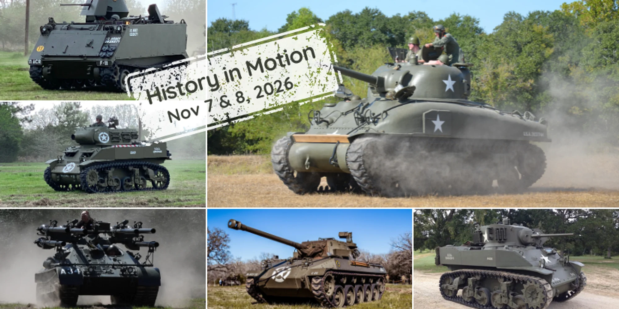 Coming November 7 & 8, 2026 Tanks, Tanks, Tanks! Feel the ground shake and engines roar at the Museum of the American G.I.’s History in Motion! Watch historic tanks, military vehicles, and artillery spring to life in a thrilling, action-filled weekend that brings the past into the present. You’ll experience one of the South’s premier collections of fully restored WWII and Vietnam-era vehicles—in motion. This family-friendly event is packed with exciting activities for all ages! Tanks and vehicles will run throughout the day, with special demonstrations featuring historic weapons, artillery, and rare vehicles. Between shows, explore the displays up close—or climb aboard for a ride in a WWII tank or Half-Track! We begin each day with a special presentation of the National Anthem at 10:00 AM, setting the stage for the day’s events. The event will showcase special weapons demonstrations, and TWO BIG Vehicle Demonstrations. Make sure you do not leave early or you will miss the finale: a powerful artillery demonstration that ends the day with a BOOM! Gates open at 9:00 AM Event hours: Saturday & Sunday, 10:00 AM – 3:00 PM FREE Parking is available at Santa’s Wonderland’s Blitzen Lot. From there, you enter the museum grounds through the admission tent. TICKET INFORMATION One Day Tickets (Cash price) $25 Adults, $10 Kids (5-17), Under 5 free Speed through the line by purchasing admission tickets online! Available starting September 9, 2026, at 10 AM Click the button below for a list of activities! History in Motion is a “Special Event Day’ and regular admission prices are not valid. This is an outdoor event, and the museum building will not be open during History in Motion.