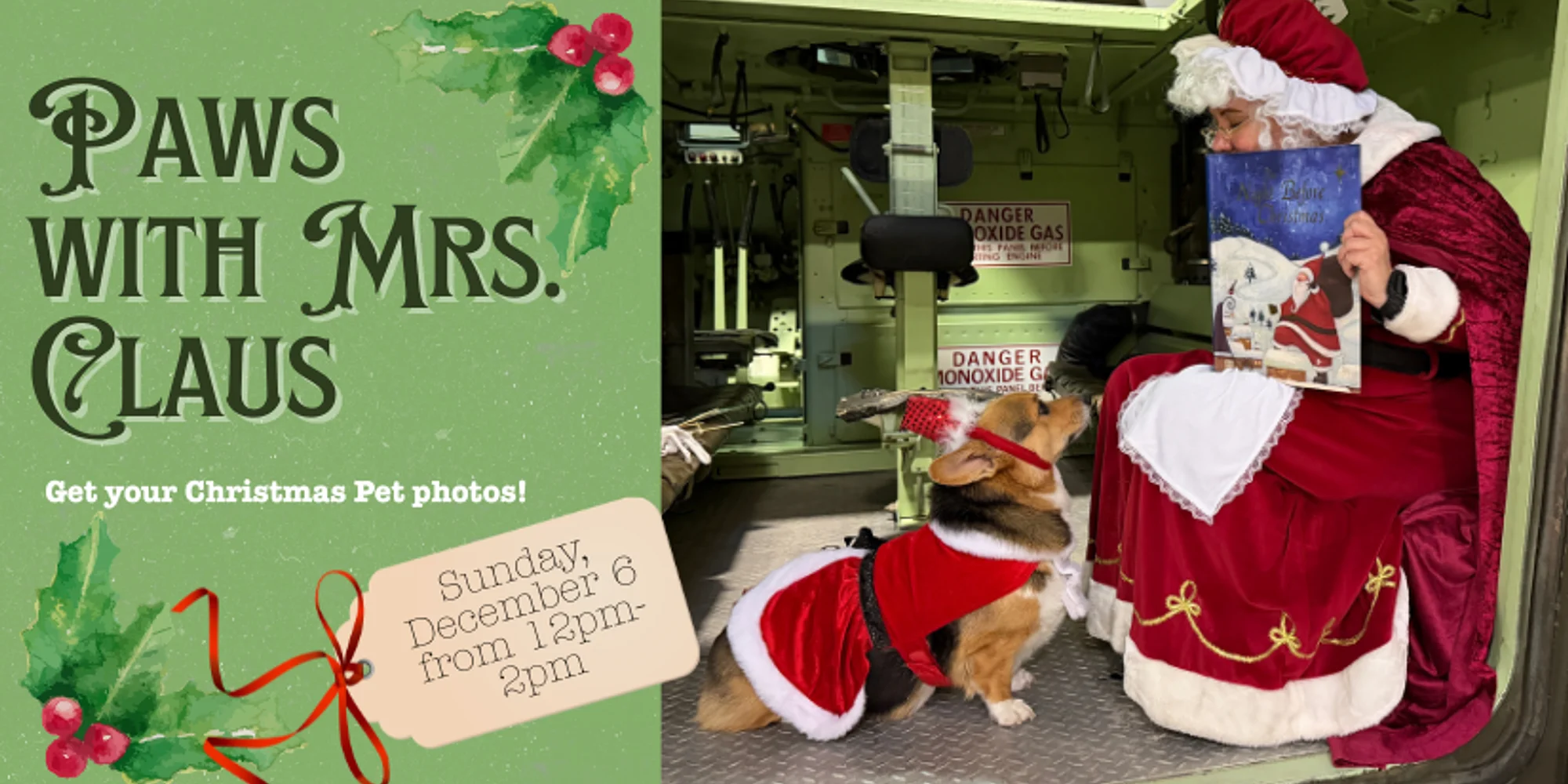 Bring your furry friends for a festive photo with Mrs. Claus at the Museum of the American G.I.! On Sunday, December 6, from 12 pm to 2 pm, bring your pet to the museum, whether they’ve been naughty or nice, for a festive picture with Mrs. Claus! A perfect way to capture a holiday memory you’ll treasure all season long! While you’re here, enjoy our seasonal decorations and explore the museum’s exhibits. Dress your pets in their holiday best — we can’t wait to see those festive outfits! Pet photos with Mrs. Claus and admission to the museum are $10 on December 6 from 12:00 p.m. to 2:00 p.m.