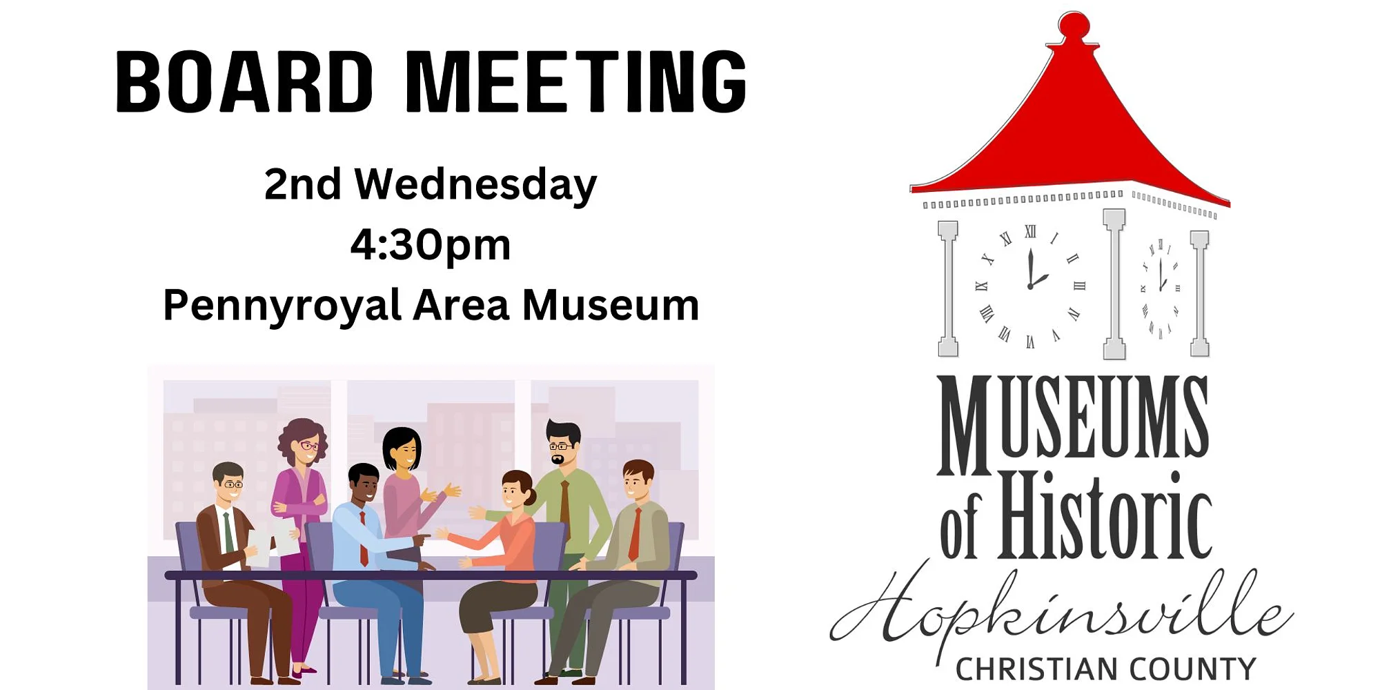 This month’s meeting of the Board of Directors of the Museums of Historic Hopkinsville-Christian County will be held Wednesday, February 11, 2026 at 4:30pm at the Pennyroyal Area Museum (217 E. 9th Street). FEBRUARY’S DRAFT AGENDA Call to Order and Review Board Meeting Agenda Review and Approve January 2026 Meeting Minutes Special Presentation: FY25 Audit, Calhoun & Company Unfinished Business Woody Winfree Fire-Transportation Museum Update New Business To be announced Board & Committee Reports Director’s Report Treasurer’s Reports Collections Committee Report Visioning Committee Announcements Adjournment The Board of Directors of the Museums of Historic Hopkinsville-Christian County meets monthly on the second Wednesday at 4:30pm. Meetings are conducted at the Pennyroyal Area Museum and are open to the public. There is no meeting in December. Upcoming meeting dates: February 11, 2026 March 11, 2026 April 8, 2026 May 13, 2026 June 10, 2026