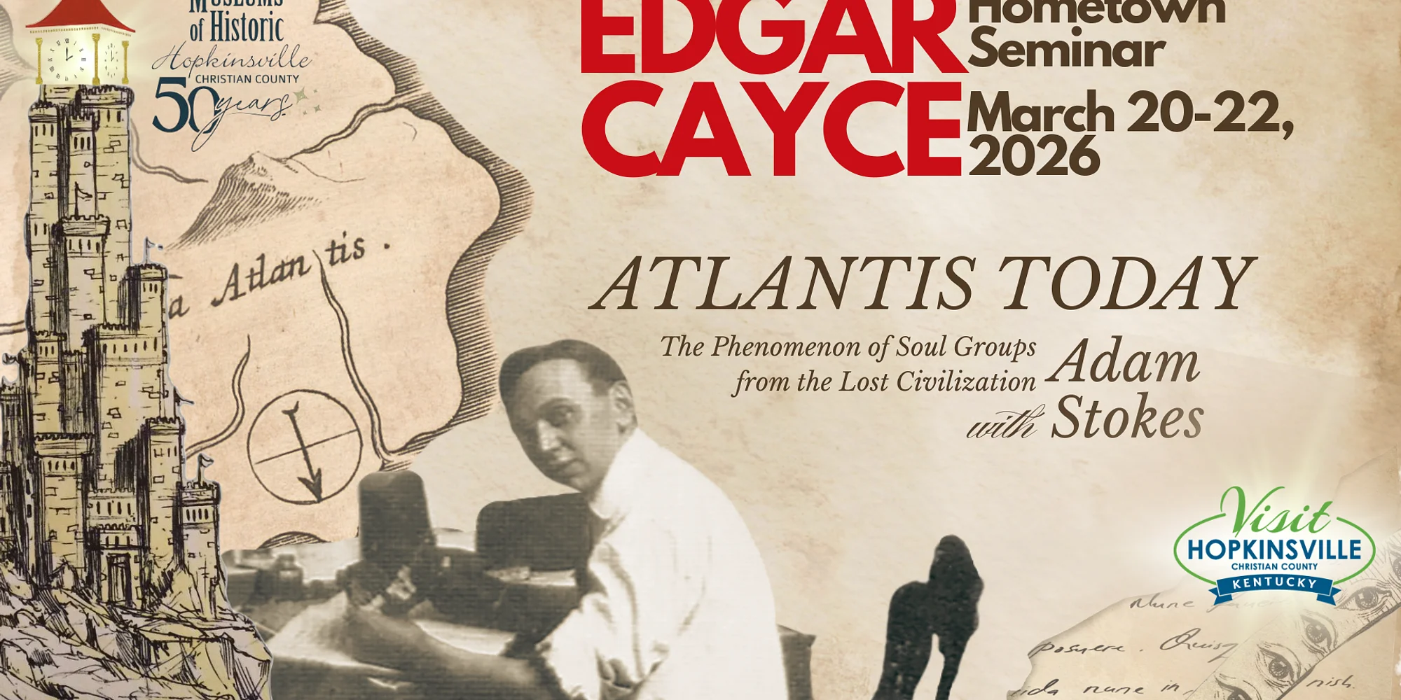 Register for the Edgar Cayce Hometown Seminar! The Museums of Historic Hopkinsville-Christian County are making plans to celebrate the work of psychic Edgar Cayce the weekend of Friday, March 20 through Sunday, March 22, 2026. Join us in downtown Hopkinsville for activities that center around Edgar Cayce’s roots in Christian County and the major impact he continues to make throughout the world. The weekend will feature special presentations by keynote speaker Adam Stokes and professional astrologer Mallory Key. Born in Christian County in 1877, Edgar Cayce displayed great gifts of clairvoyance that he used to help thousands of people overcome health and other problems. Widely known as the “Sleeping Prophet,” Cayce is credited at being an early force in holistic medicine and the New Age movement. His lifetime work continues to provide healthy living goals, spiritual ideals, and life lessons today. Keynote speaker Adam Stokes is a published author, professor, and scholar with degrees in religion from Duke University and Yale Divinity School. His presentation, “Atlantis Today: The Phenomenon of Soul Groups from the Last Civilization,” will bring an academic framework to Cayce’s esoteric tradition, drawing on Stokes’ own research in ancient civilizations, classical studies, and biblical history. Mallory Key is a professional astrologer accredited with the American Federation for Astrologers. Bringing more than 15 years experience, Key brings insight into the astral influences that affect our daily lives. Registration is required for all learning sessions. Register for the full weekend for $100 ($90 for Museum Members) or $25 per session online or by calling the museum at 270-887-4270. Visiting from out of town? The Holiday Inn and Suites in Hopkinsville is offering a discounted rate of $124 per night for the weekend. Use this direct booking link to book with the Edgar Cayce Hometown Seminar Group. Call the hotel directly at 270-887-8600 for more information about rooms. For more information and to register for sessions, visit our Facebook page, website, or call the Museums at 270-887-4270. Thank you to our sponsor Visit Hopkinsville! Edgar Cayce Hometown Seminar 2026 Schedule All events will take place at the Museums of Hopkinsville, located at 217 E. 9th St. Hopkinsville, KY, unless otherwise specified. Friday, March 20, 2026 5:00-6:00pm: Opening Reception at Museum 6:00pm: Alissa Keller & Grace Abernethy, Welcome and Grounding in Hopkinsville 6:30pm: Mallory Key, “Astrology and Consciousness in the New Earth” Saturday, March 21, 2026 8:30am: Morning Exercises 9-10:30am: Adam Stokes, “Sons of Light and Darkness: Edgar Cayce’s History of Atlantis” 10:45-4:00pm: Free time/various activities (some non-museum events may have additional fee) Anytime: Labyrinth Walk, Downtown Hopkinsville Anytime: Museum’s Cayce Artifacts, Museum Anytime: Cell Phone Tour Anytime: Fairy garden supplies, Museum Anytime: Exploration of Riverside Cemet...