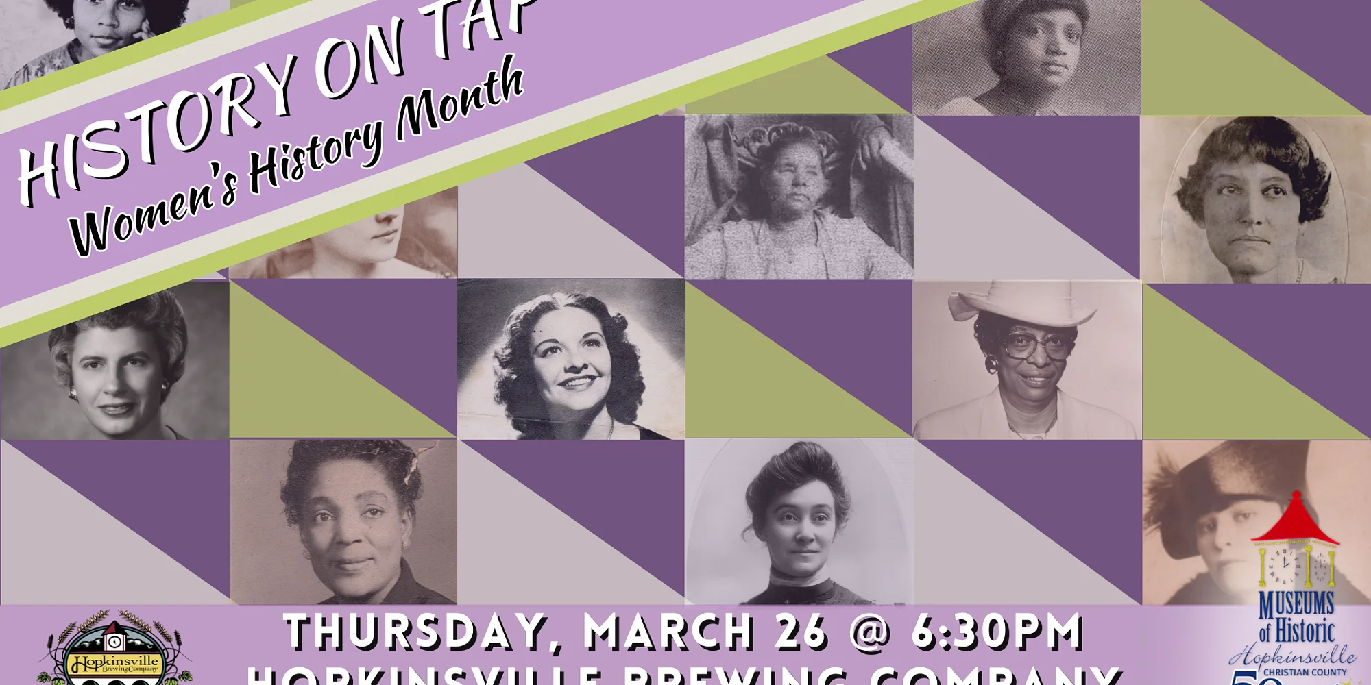 The Museums of Historic Hopkinsville-Christian County invites you to History on Tap Thursday, March 26 at 6:30pm in celebration of Women’s History Month! From politicians to teachers and from athletes to artists, this program will feature short biographies of local women who made a big impact on our community. Raychel Farmer, Francene Gilmer, Heather Lancaster, Tiffany Luna, Melanie Noffsinger, and Margaret Prim – all women who run nonprofits downtown – will be our presenters. History on Tap is a free series that seeks to share local history in a relaxed, fun setting. Programs are typically held on the last Thursday of the month at 6:30pm at Hopkinsville Brewing Company. For more information, follow us on Facebook or give us a call at 270-887-4270.