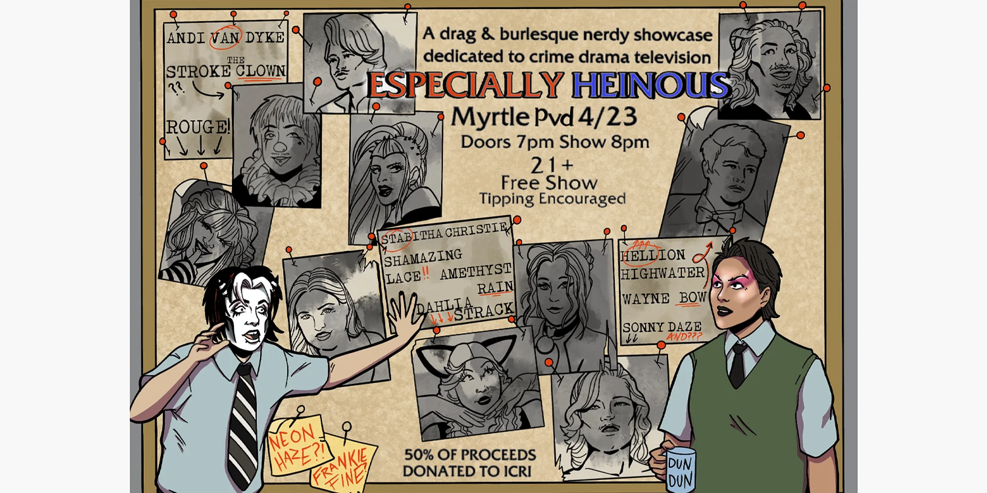 Especially Heinous (BE GAY & DO CRIME)! A nerdy drag & burlesque showcase dedicated to crime drama TV! From the obsessive minds of producers / hosts Ricky Mortis and Rocco Rosé! Feat. Amethyst Rain Andi van Dyke Dahlia Strack Hellion Highwater Rouge Shamazing Lace Sonny Daze Stabitha Christie Stroke the Clown Wayne Bow and others?? Poster made by Ricky Mortis!