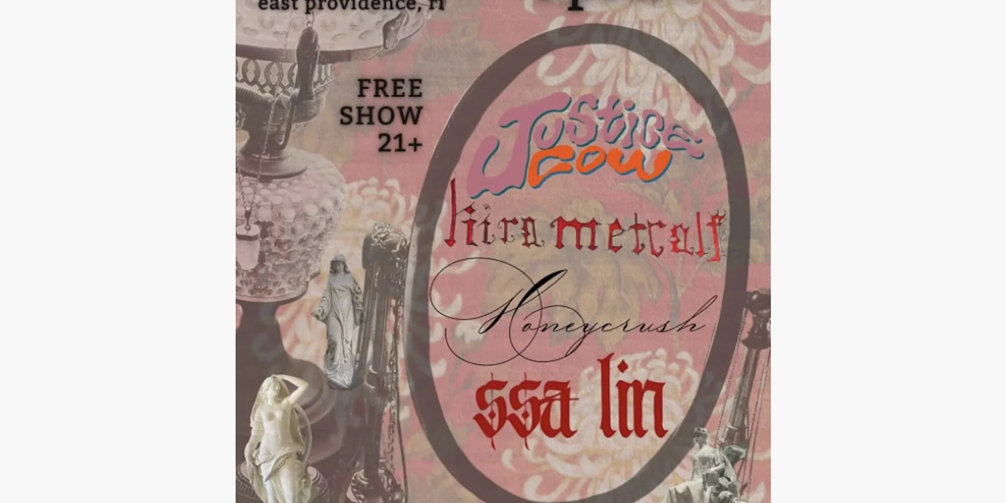 FREE show/21+ Tips/donations to artists are encouraged and appreciated. Justice Cow is an indie rock band from Providence, RI fronted by Jessica Kion. Her music spans the edges of sparking delicate folk to explosive cathartic rock. Jess’ songs speak to loss and love and always include an invitation to sing along. Justice Cow released “Live at Big Nice Studio” on July 14th. The band is writing and playing extensively through the Fall before heading back to the studio to record their next album. When Jess isn’t on the road, she is heavily involved in the Providence music community mentoring students at New Urban Arts, teaching a songwriting workshop at Brown University, and collaborating with all of your favorite musicians. Kira Metcalf is here for a long time, not a good time. Blending poetic lyricism with dynamic vocals, Metcalf’s songwritingexamines the agonizing contradictions of sexuality, womanhood, grief, and late stage capitalism. Like the compulsive urge to pick a scab, her music lures you into emotional landscapes that, though frightening to look at, are impossible to turn away from. Honeycrush is the solo project of New York singer-songwriter and poet Alexandra Antonopoulos. Characterized by evocative storytelling and raw, emotive vocals, Honeycrush blurs the edges of alternative and indie rock drawing on the influences of ‘90s permawave artists like Fiona Apple, Nirvana, PJ Harvey, and Jeff Buckley. On her debut EP MILK TEETH, Antonopoulos tries to reconcile the relationship between pain and growth, and instead of turning away from her flaws and worst days, takes a microscope to them. Obsessive longing, embittered grief, impotent rage, and the relentless pursuit of self-improvement are inescapable realities that Antonopoulos refuses to condemn. ssa lin (pronounced like "sullen") is the Providence-based indie folk/pop project by Melissa Chaplin. Lust, debt, romance, self-discovery and existential dread are turned into songs that sound as though they could be written by the millennial love-child of Fiona Apple and Fleetwood Mac. Debut album “baby” coming June 2026.