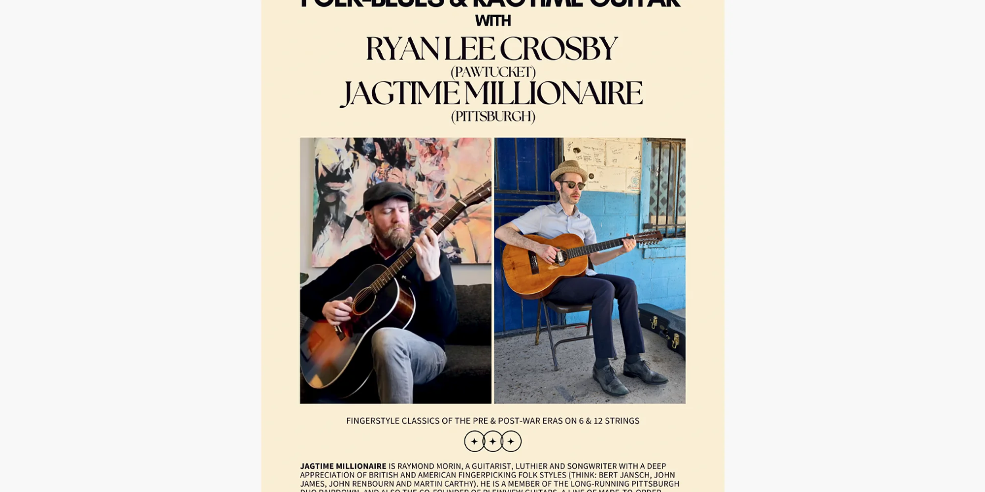 RYAN LEE CROSBY is based in Rhode Island, but his musical heart is in Mississippi. He has released numerous albums, toured internationally and is a leading practitioner of the Bentonia School of rural Delta blues, as well as a world music explorer. Smithsonian Magazine praised his ability to "bring influences from Africa and India to the Bentonia sound." JAGTIME MILLIONAIRE is Raymond Morin, a guitarist, luthier and songwriter with a deep appreciation of British and American fingerpicking folk styles (think: Bert Jansch, John James, John Renbourn and Martin Carthy). He is a member of the long-running Pittsburgh duo Pairdown, and also the co-founder of Pleinview Guitars, a line of made-to-order custom steel-string guitars.