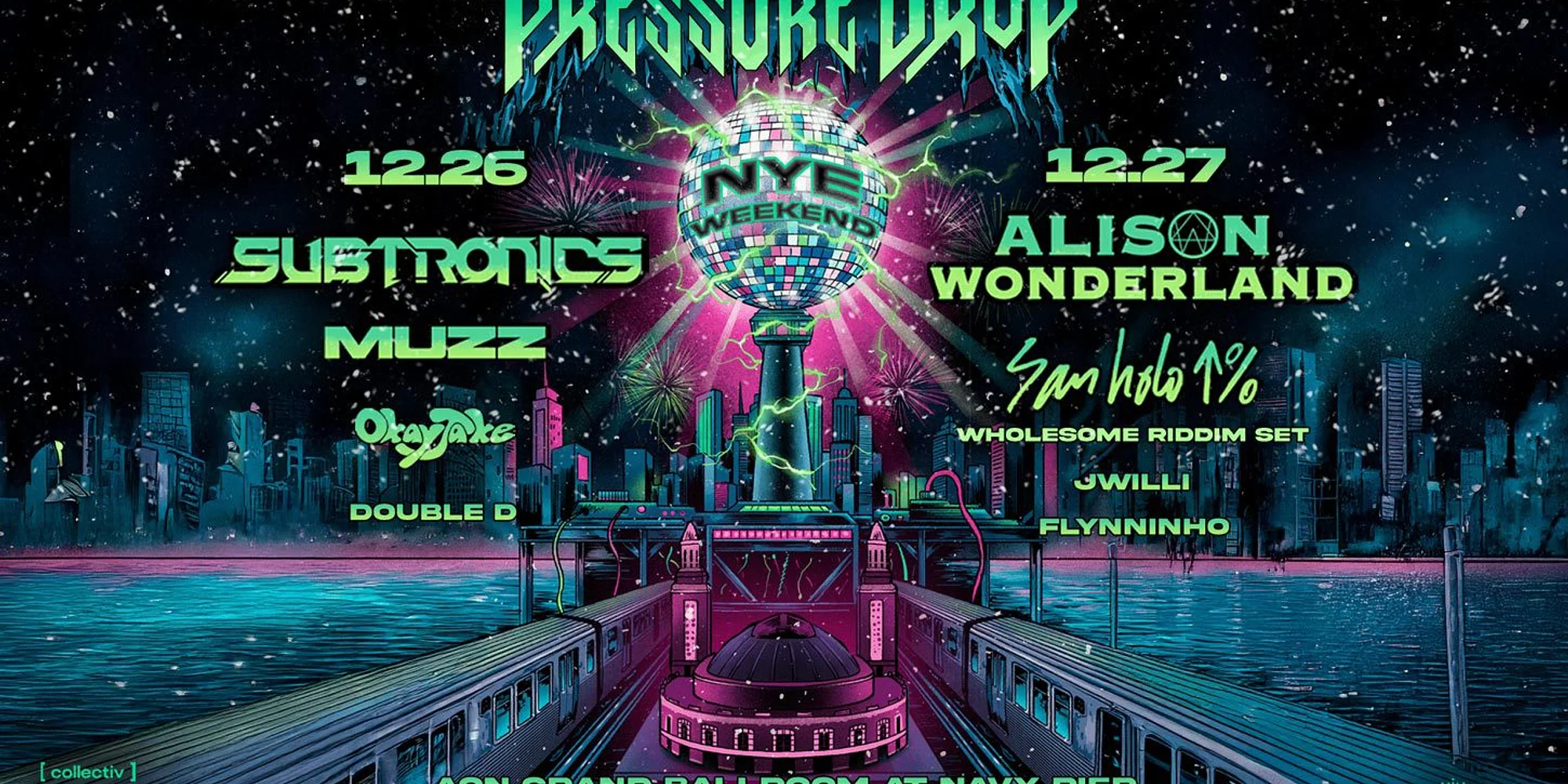 2 Nights + 2 Lineups. The pressure is building! Join us for TWO nights, December 26 & 27 for two special lineups: Night One: December 26 -Subtronics -Muzz -OkayJake Night Two: December 27 -Alison Wonderland San Holo Wholseom Riddim Set