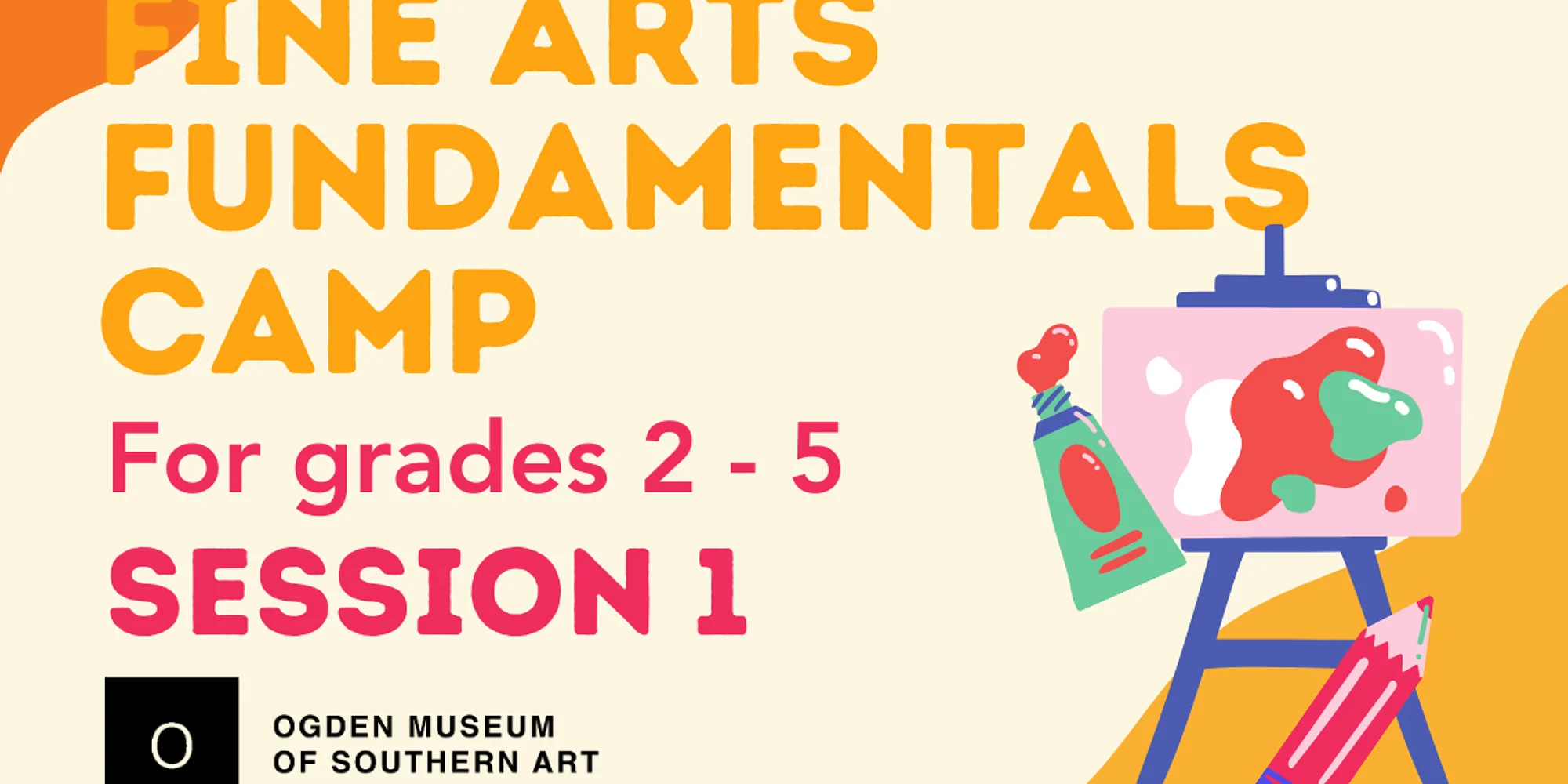 Fine Arts FUNdamentals Camp: Session I For campers entering grades 2 – 5 June 8 through June 12 (1 week) | 9 a.m. to 3 p.m. Spark your child’s creativity by enrolling your young artist in Fine Arts FUNdamentals, facilitated by art educators Myron Solomon and Makayla Howard. During each week-long session, campers will be immersed in creativity and discover the diverse world of Southern Art. In this series of small, specialized camps, kids in grades 2 through 5 explore various art forms, including painting, drawing, printmaking, sculpture, and textiles, while also learning about the artists who shape the South! Every session is fresh, fun and designed to inspire, culminating in a special gallery exhibition celebrating campers’ amazing creations. Don’t miss this chance for your child to make art, new friends and lasting memories! Campers should come to camp each day with a water bottle, snack, lunch and an extra layer. $300 members / $350 not-yet-members button Not a museum member? Save money on this summer camp and others like it, plus receive exclusive privileges like unlimited free museum admission, private exhibition previews and so much more when you join Ogden Museum today! Membership begins at the low price of $60. Join the O today UPCOMING SUMMER CAMPS AT OGDEN MUSEUM Click the title of each camp to learn more about each camp! Register for one session or for multiple sessions. Each session features new and exciting crafts and lessons. Monday, June 8 through Friday, June 12 Fine Arts FUNdamentals Session I Monday, June 15 through Friday, June 19 Fine Arts FUNdamentals Session II Monday, June 22 through Friday, June 26 Fine Arts FUNdamentals Session III Monday, July 6 through Friday, July 10 Fine Arts FUNdamentals Session IV Monday, July 13 through Friday, July 24 Fashion Institute Monday, June 22 through Friday, June 26 and Monday, July 6 through Friday, July 10 Photography & Exhibition Design Camp Questions? Email education@ogdenmuseum.org Ogden Museum Camps are sponsored in part by the New Orleans Jazz and Heritage Foundation, Inc.