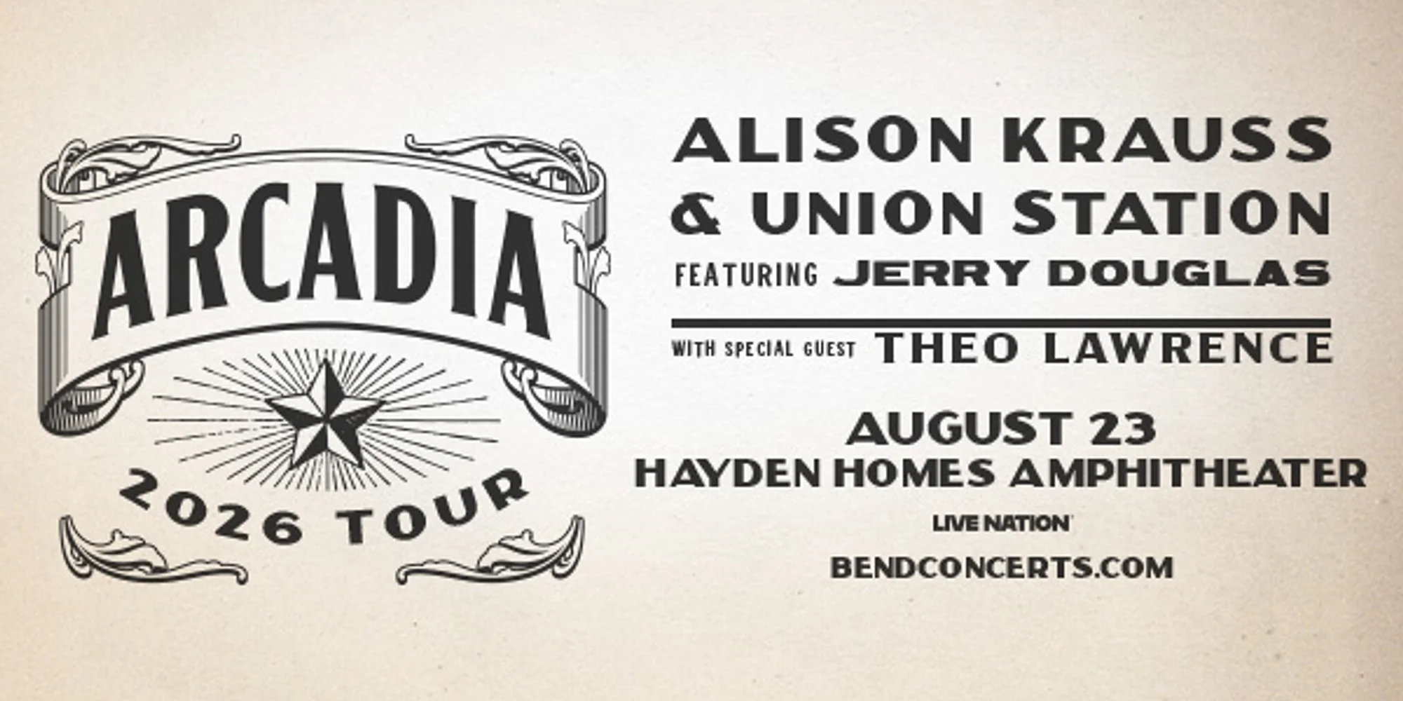 Alison Krauss & Union Station featuring Jerry Douglas With special guest Theo Lawrence Sunday, Aug. 23 Doors open at 6 p.m. Show starts at 7:30 p.m. Tickets on sale now. Available online or in-person at the Ticket Mill in the Old Mill District. Chair rentals for General Admission tickets available while supplies last. If you think you’ll want a chair at the show, we recommend securing your rental at the time of ticket purchase. Note: chair set up location may be designated on show night. “Many people in bluegrass music talk about being born in the wrong decade,” says Alison Krauss, “and whenever I sing, the pictures I see in my head take place in a particular time. That’s what happened with these tunes, maybe even more so than in the past.” For nearly four decades, Alison Krauss & Union Station have been celebrated as one of the most influential acts in bluegrass and roots music. Known for an immaculately crafted but endlessly surprising sound, the group has returned with “Arcadia,” their first album since the 2011 masterpiece “Paper Airplane,” a multiple Grammy Award-winning LP that debuted at #1 on the Billboard Country, Bluegrass, and Folk Album charts. They may not have released an album in 14 years, but Krauss never stopped thinking about the next Union Station project or gathering songs that might fit. “Over the years, you’ll hear something, but it’s not time for it,” she says. “You say to yourself, ‘Oh, this is beautiful, I’m going to set it aside and wait. I have a place behind my desk with songs that I collect, including CDs and cassettes of songs I’ve kept for 30, 40 years.” Still, she needed the one song that would bring things into focus, that felt like a starting point, before she would pick up the phone and start mobilizing the band. “Usually, I find something that’s a first song – ‘Here’s the beginning’ – and then things fall into place. That song was “Looks Like the End of the Road.” Jeremy Lister wrote it, and he’s one of my favorites. It just felt so alive, and as always, I could hear the guys already playing it. We’ve always been very grateful as a band to have come across such beautiful songs through the years and to be like-minded enough to create this life together.” The members of Union Station are a team of virtuosos, all with thriving solo careers. Krauss (fiddle, lead vocal) signed to Rounder Records at age 14 and has gone on to sell over 12 million albums, earning 27 wins and 44 nominations from the Grammy Awards. Jerry Douglas (Dobro, lap steel, vocals), Ron Block (banjo, guitar, vocals), and Barry Bales (bass, vocals) are all award-winning players, songwriters, and producers who have worked with and are considered some of the greatest musicians in the world. For Krauss, returning to a more traditional approach after spending so much time recording and touring with Robert Plant (including 2021’s acclaimed “Raise the Roof,” the follow-up to 2007’s “Raising Sand,” which won the Grammy for Album of the Year)...