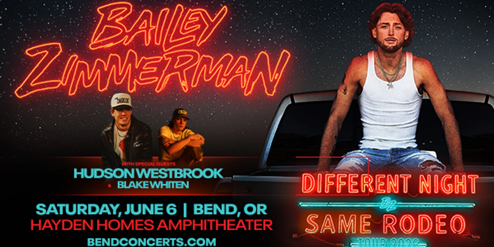 Bailey Zimmerman Special Guest: Hudson Westbrook and Blake Whiten Saturday, June 6 Doors open at 5:30 p.m. Show starts at 7 p.m. Tickets on sale now. Available online or in-person at the Ticket Mill in the Old Mill District. Chair rentals for General Admission tickets available while supplies last. If you think you’ll want a chair at the show, we recommend securing your rental at the time of ticket purchase. Note: chair set up location may be designated on show night. Hailing from Louisville, Illinois, multi-platinum singer-songwriter Bailey Zimmerman is one of country music’s brightest stars, known for his chart-topping hits and authentic, gritty sound. After first gaining traction by posting original songs to social media in 2020, Zimmerman rocketed into the spotlight with the viral success of “Fall in Love,” which made him the fastest debut country artist to reach No. 1 on Billboard’s Country Airplay chart in over a decade. In 2023, Zimmerman released his debut album “Religiously. The Album.” which arrived as not only the biggest streaming debut for a country album in history, but also the biggest all-genre streaming debut since 2021. The “comfortably bruising and appealingly bruised” (The New York Times) album also features his fourth consecutive No. 1 single “Where It Ends,” his 4x-Platinum, No. 1 debut single, “Fall In Love,” and its 5x-Platinum follow-up, the six-week No. 1 mega-hit “Rock And A Hard Place.” The album debuted at #3 on the Top Country Albums chart and #7 on the Billboard 200, instantly positioning him as one of the genre’s most impactful new voices. In 2024, Zimmerman continued to dominate the charts with singles “Holy Smokes,” “Holding On,” and “New To Country” all of which made a splash. August of 2025 saw the release of Zimmerman’s sophomore album “Different Night Same Rodeo” which features superstar collaboration “Backup Plan” featuring Luke Combs as well as Top 10 and platinum single “Holy Smokes,” in addition to “New To Country,” “Hell or High Water,” “Holding On,” “Comin’ In Cold,” and more. Zimmerman has earned multiple award nominations, including nods from the Billboard Music Awards, ACM Awards, People’s Choice Country Awards, and CMT Music Awards – cementing his status as one of country music’s fastest-rising stars. He has ignited television audiences across the country with show-stopping performances on “Good Morning America,” “TODAY,” “The Tonight Show Starring Jimmy Fallon,” “Jimmy Kimmel Live!,” the 58th Academy of Country Music Awards, and the 2024 CMT Music Awards and more. Beyond the stage, Zimmerman has drawn widespread acclaim from top-tier media outlets including Forbes, Rolling Stone, Variety, Los Angeles Times, Billboard, American Songwriter, and more. EVENT DETAILS + TICKETS