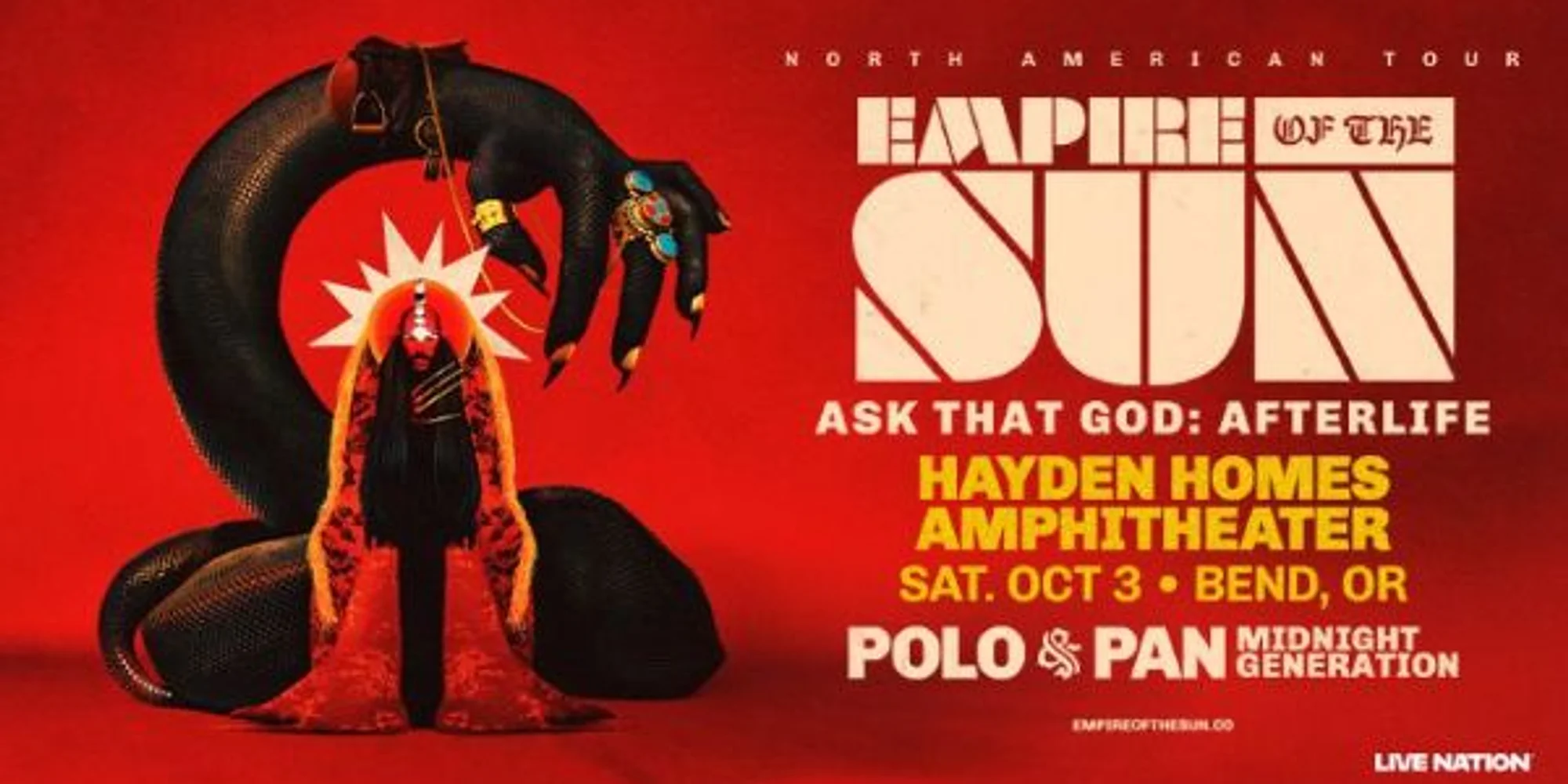 EMPIRE OF THE SUN Saturday, Oct. 3 Doors open at 5 p.m. Show starts at 6:30 p.m. Online-only venue presale starts Thursday, March 19 at 10 a.m. If not already, sign up for Concert Alerts to receive presale code. General onsale starts Friday, March 20 at 10 a.m. online or in-person at the Ticket Mill in the Old Mill District. Chair rentals for General Admission tickets available while supplies last. If you think you’ll want a chair at the show, we recommend securing your rental at the time of ticket purchase. Note: chair set up location may be designated on show night. Empire of the Sun is one of Australia’s most visionary music projects, created by Luke Steele and Nick Littlemore. Since their landmark album debut “Walking On A Dream,” featuring global anthems “Walking On A Dream” and “We Are The People,” Empire of the Sun has captivated millions with its euphoric fusion of electronic pop and surreal performance. Follow-up albums “Ice on the Dune” and “Two Vines” delivered fan favorites like “Alive,” “DNA,” “High and Low,” and “Way To Go,” and after an 8-year hiatus, 2024’s “Ask That God” opened a bold new chapter, with singles, “Changes”, “Music On The Radio”, “Cherry Blossom” and others, pushing their celestial sound into uncharted territory. Empire forges on, reaching Empyreans across the globe. EVENT DETAILS + TICKETS
