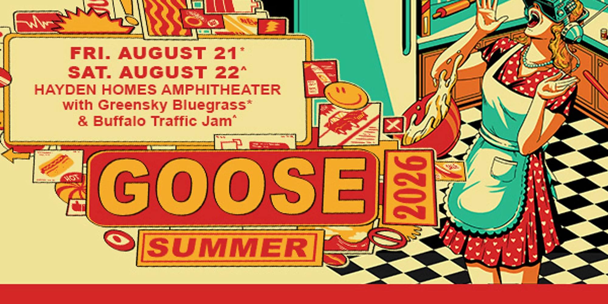Goose Night 2 With special guest Buffalo Traffic Jam Saturday, Aug. 22 Doors open at 3:30 p.m. Show starts at 5 p.m. Tickets on sale now. Available online or in-person at the Ticket Mill in the Old Mill District. Chair rentals for General Admission tickets available while supplies last. If you think you’ll want a chair at the show, we recommend securing your rental at the time of ticket purchase. Note: chair set up location may be designated on show night. Special Guest Lineup: Night 1: Greensky Bluegrass Night 2: Buffalo Traffic Jam Two-Night Ticket Bundles will be available, while supplies last, HERE. Goose is an American rock band known for its genre-blending sound, improvisational live performances, and dedicated fan base. The band is Rick Mitarotonda (vocals, guitar), Peter Anspach (vocals, keys, guitar), Trevor Weekz (bass) and Cotter Ellis (vocals, drums). Their music — a deft union of indie-rock hooks, sprawling improvisation, and driving rhythm — has propelled them from Connecticut basements to headlining Madison Square Garden, Radio City Music Hall, Red Rocks, Forest Hills Stadium, and more. Known for their DIY ethos, Goose has grown organically through relentless touring and using platforms like YouTube, Bandcamp, and nugs.net to share live performances and connect with fans. Their fifth studio album, “Chain Yer Dragon,” was released just four months after “Everything Must Go,” their first release since 2022’s critically acclaimed “Dripfield,” which earned them #2 on Billboard’s “Top New Artist Albums” chart and praise from Rolling Stone. “Everything Must Go” drew from the feel of Goose’s live performances, featuring re-imagined live staples and songs that captured their evolving sound. Its first single, “Give It Time,” went to #6 on the AAA Radio charts, with “Your Direction” joining it for two simultaneous charting singles. Goose has performed on “The Tonight Show,” “Jimmy Kimmel Live!,” “CBS Saturday Morning,” and played Bonnaroo, ACL, and more. Goose continues to evolve while staying rooted in their commitment to connection, creativity, and the shared joy of live music. “Someone asked me, how do you sing these tragic tunes?,” she says. “I have to. It’s a calling. I feel privileged to be a messenger of somebody else’s story. And I want to hear what happened.” EVENT DETAILS + TICKETS