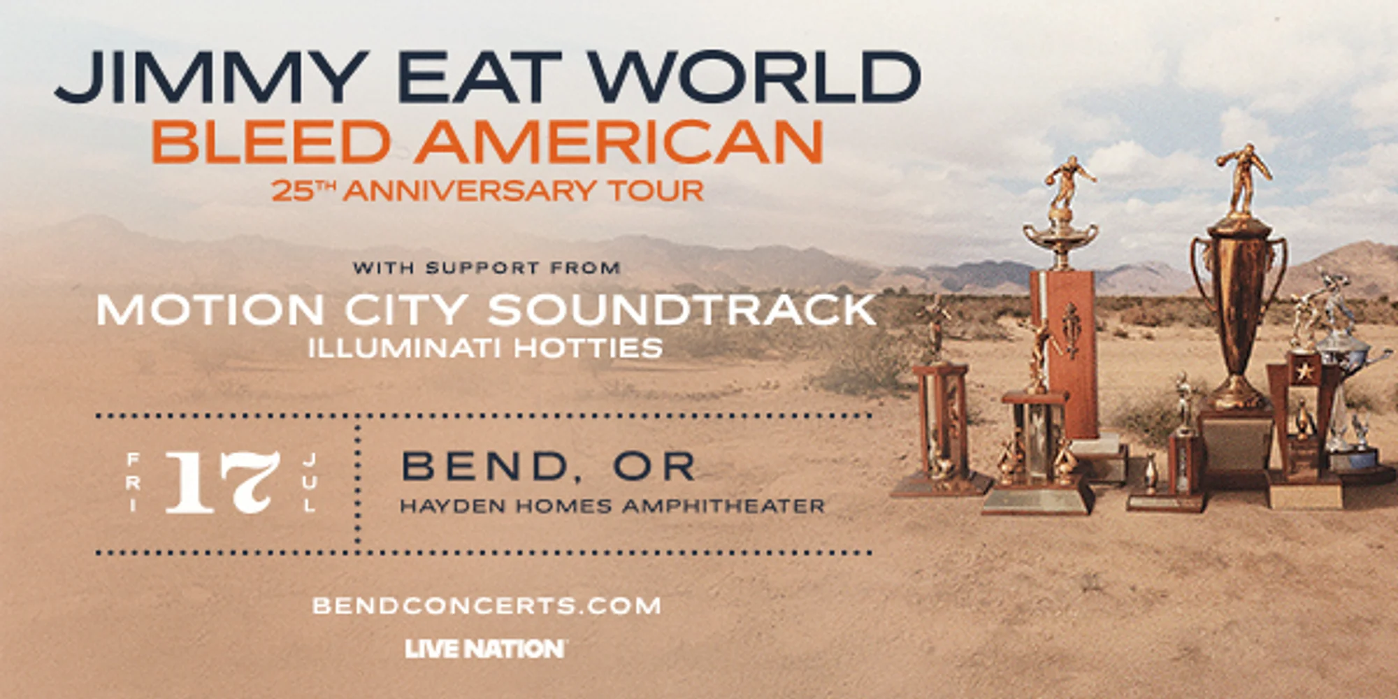 JIMMY EAT WORLD Friday, July 17 Doors open at 4:30 p.m. Show starts at 6 p.m. Tickets on sale now. Available online or in-person at the Ticket Mill in the Old Mill District. Chair rentals for General Admission tickets available while supplies last. If you think you’ll want a chair at the show, we recommend securing your rental at the time of ticket purchase. Note: chair set up location may be designated on show night. Emerging as a trailblazing name in the mid-’90s emo scene, Jimmy Eat World eventually found a larger audience by embracing a blend of alternative rock and power pop that targeted the heart as well as the head. The band’s influence widened considerably with 1999’s “Clarity,” an album that has since emerged as a landmark of the emo genre, but it was the follow-up, 2001’s “Bleed American,” and the infectious single “The Middle” that broke them into the commercial rock mainstream. The emo label proved difficult to shake throughout the 2000s, even when subsequent Top Ten albums “Futures” and “Chase This Light” did little to evoke the hard-edged sensitivity of “Clarity,” but Jimmy Eat World still remained a league above the generation of genre torchbearers they helped spawn. Settling into comfortable veteran status in the 2010s, the band continued to issue reliable Top 20 efforts, rounding out the decade with their tenth album, 2019’s “Surviving”. This summer, Jimmy Eat World return to Hayden Homes Amphitheater for the 25 Years of Bleed American Tour. They’re playing the whole album front to back, plus all the deep cuts and anthems that got us through everything. If you’ve been listening since the beginning or are just discovering them, this will be the emo show of your summer! EVENT DETAILS + TICKETS