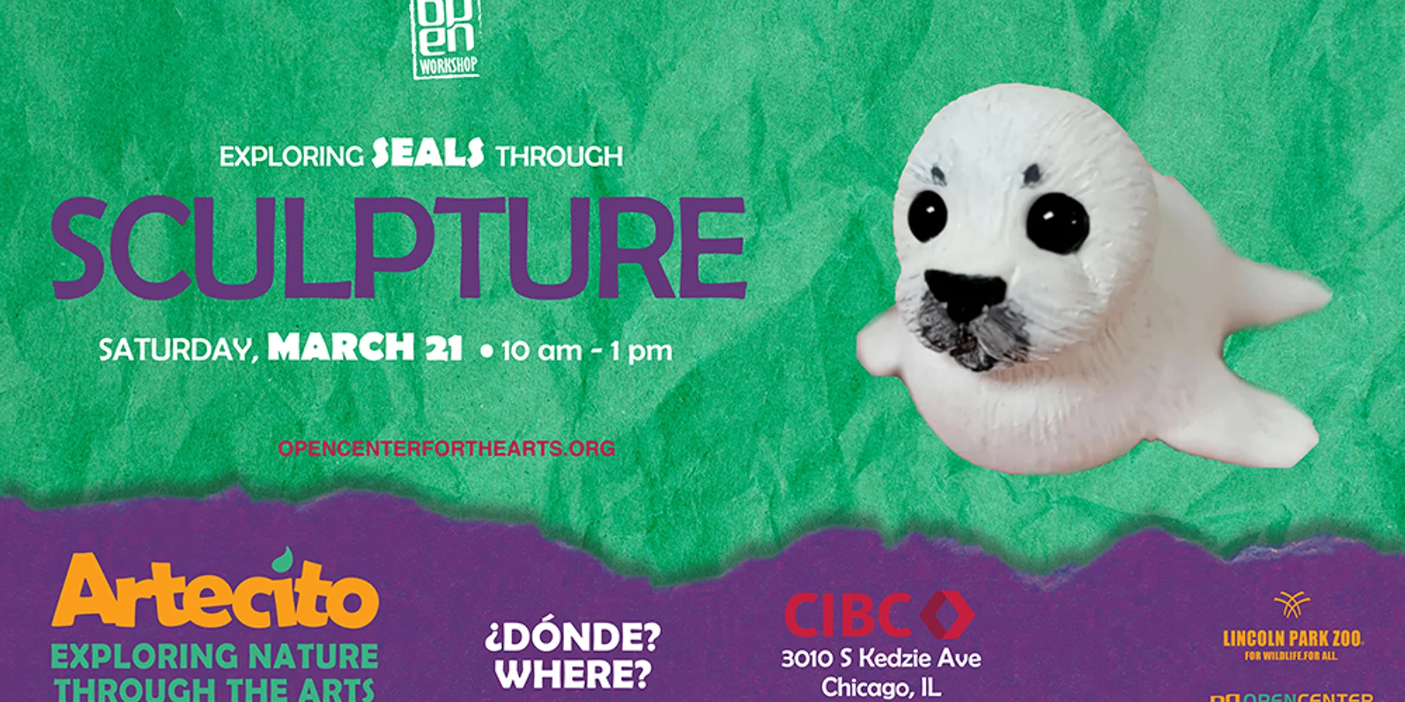 How can seals hold their breath long enough to sleep underwater? Join us as we explore more about the seals with our friends at Lincoln Park Zoo! In person at CIBC! 3010 South Kedzie Avenue Chicago, Illinois 60623 10AM-1PM, materials will be provided. ____________________________________ ¿Cómo pueden las focas contener la respiración el tiempo suficiente para dormir bajo el agua? Acompáñanos a descubrir más cosas sobre las Focas con nuestros amigos del zoo de Lincoln Park. ¡Presencialmente en CIBC! 3010 South Kedzie Avenue Chicago, Illinois 60623 10AM-1PM, se proporcionarán materiales. What is Artecito? Artecito is a free workshop by OPEN Center for the Arts and Lincoln Park Zoo that uses the arts to engage families with nature in ways that resonate with local holidays, culture, and wildlife. With a related art activity, workshops highlight wildlife and nature to encourage children and families to think about nature and their relationship to it in creative ways. ¿Qué es Artecito? Artecito es un taller gratuito desarrollado por OPEN Center for the Arts y Lincoln Park Zoo que utiliza las artes para involucrar a las familias con la naturaleza de maneras que resuenan con las festividades locales, la cultura y la vida silvestre. Con una actividad artística relacionada, los talleres destacan la vida silvestre y la naturaleza para alentar a los niños y las familias a pensar sobre la naturaleza y su relación con ella de manera creativa