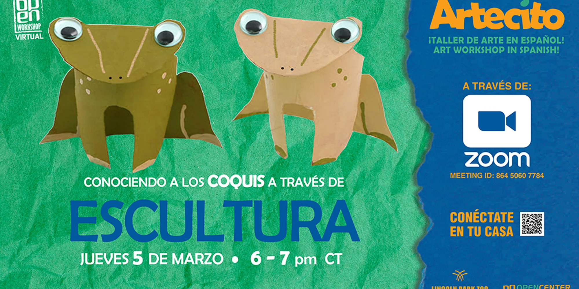 What would you do with a powerful call like a Coquí? Join us online as we explore Coquis with our friends from Lincoln Park Zoo! ¿Que harias con un canto poderoso como el de un Coquí? ¡Acompáñanos a explorar sobre los Coquí con nuestros amigos de Artecito! What is Virtual Artecito? Artecito is a free, bilingual online workshop developed by OPEN Center for the Arts and Lincoln Park Zoo that uses the arts to connect families with nature through local culture, holidays, and wildlife. Each session includes an art activity that encourages creative thinking about our relationship with the natural world. ¿Qué es Artecito Virtual? Artecito es un taller gratuito en español desarrollado por OPEN Center for the Arts y Lincoln Park Zoo que utiliza las artes para conectar a las familias con la naturaleza, la cultura y la vida silvestre. Cada sesión incluye una actividad artística que inspira a niños y familias a pensar creativamente sobre su relación con la naturaleza.