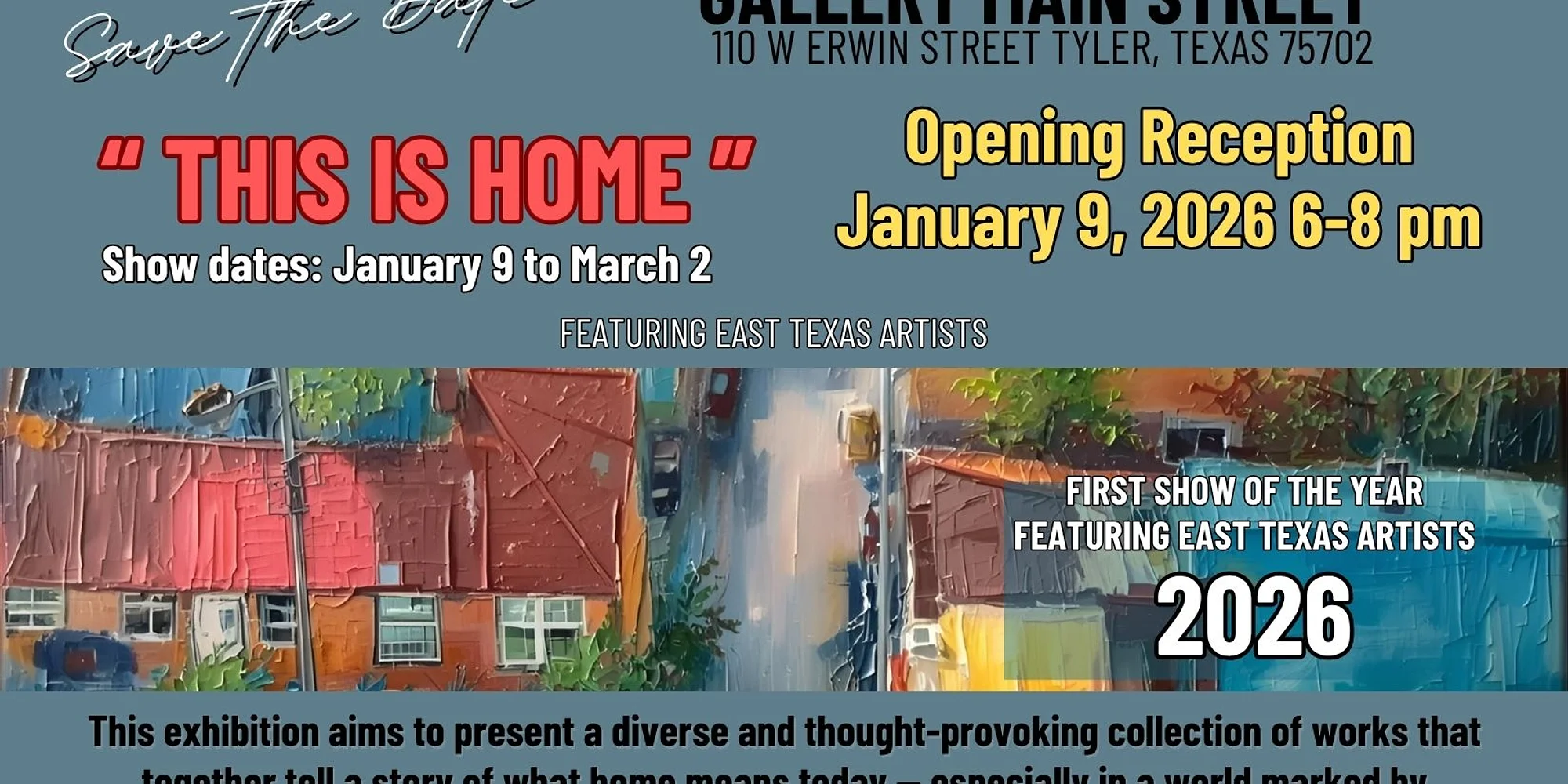This Is Home Art Exhibition & Sale Opening Reception & Meet The Artist: This exhibition, featuring East Texas Artists, aims to present a diverse and thought-provoking collection of works that together tell a story of what home means today — especially in a world marked by movement, cultural intersections, and redefined belonging. Curated works examine layers of belonging — comfort and complexity — nostalgia and transformation — architecture or landscape — body or memory — community or identity. January 9th 2026 6-8 pm Art Show is a free event and open to the public. Parking available in adjacent parking garage Locations: Gallery Main Street 110 W Erwin Street Tyler, Texas 75702