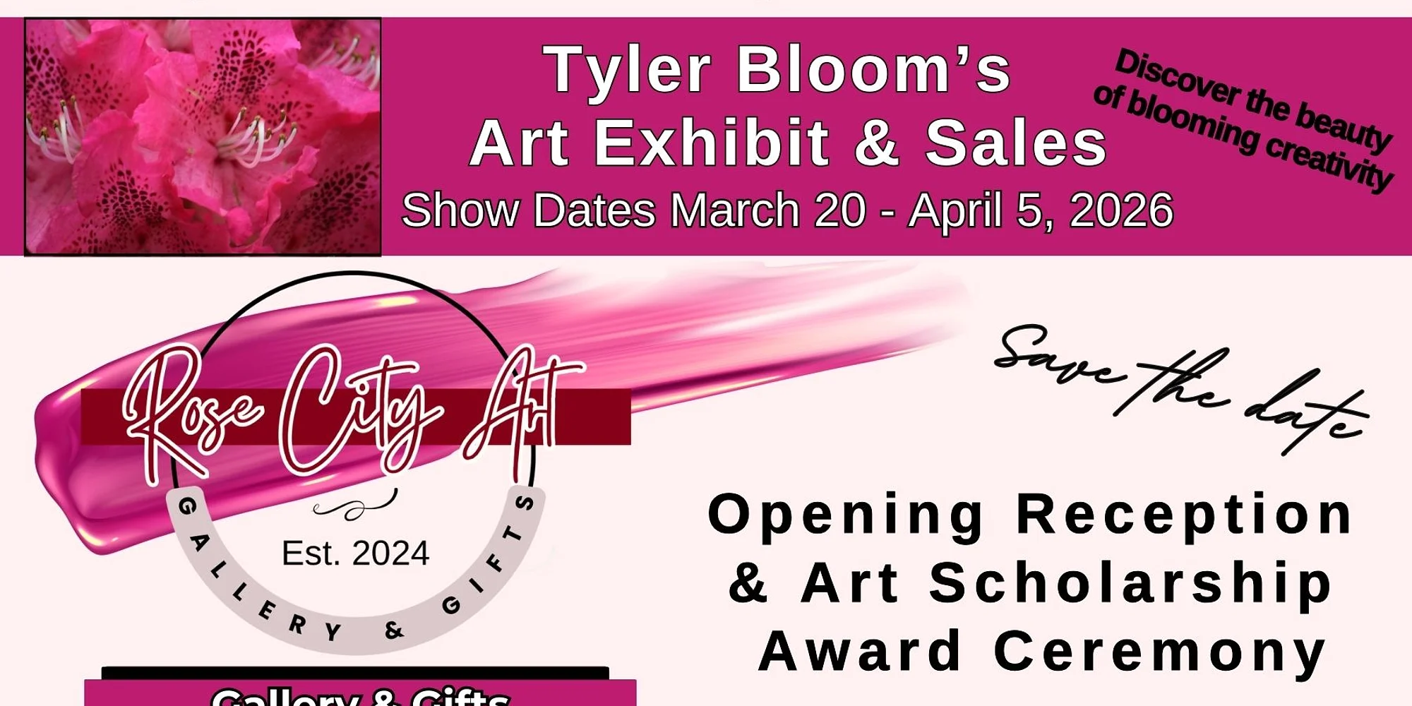 Tyler Blooms Art Show & Sale Featuring Palette of Roses Art League Artists Rose City Art Gallery Presents: Tyler Blooms Art Show & Sale — An exhibition scheduled to celebrate Tyler’s Azalea Trails event and activities. Art Projects will be available for community Involvement by visitors. This exhibition is scheduled concurrently with the 67th Annual Azalea Trails held from March 20 to April 5, 2026. Opening Reception, Meet The Artist & Scholarship Art Award Ceremony: March 20th, 5-7 pm Rose City Art Gallery & Gifts: 328 S. College Ave. Tyler, Texas 75702 Show dates: March 20th to April 5th, 2026 10-5 pm Art Show is a free event and open to the public.