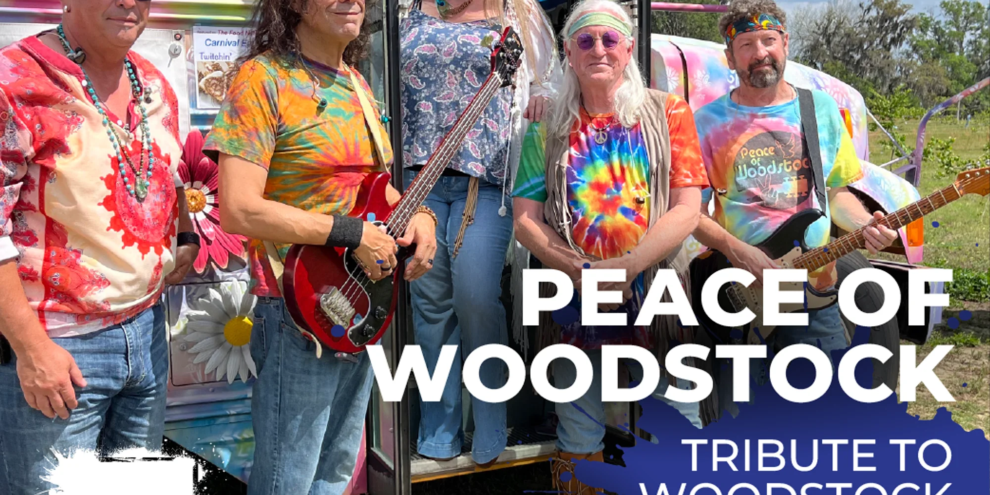This show will take you on a musical journey from the acoustic opening act of the Woodstock experience, Richie Havens, through the closing moments of the festival with the explosive, electric sounds of Jimi Hendrix. Also featured are songs from Crosby, Stills, and Nash, The Who, Janis Joplin, Sly and the Family Stone, Joe Cocker, Arlo Guthrie, Country Joe McDonald, Santana, the Jefferson Airplane, and others. Most of the members of Peace of Woodstock grew up playing together in various bands around the Tampa Bay Area, followed by many years extensively touring most of the 50 states and parts of Europe with many top groups and recognizable names in the rock world. Peace of Woodstock vocally and instrumentally recreates the fun, party atmosphere of the Woodstock experience. Peace of Woodstock will excite and bring back the greatest memories of this life changing event. Wear your favorite tie-dye shirts, your headbands and don’t forget your peace signs! BAND MEMBERS: Brent Martin – Drums Brad Trumbull – Keys/Vocals/Guitar Jen Torres – Vocals/Guitar/Percussion/Keys Alvaro Torres – Bass Guitar/Vocals Carl Peacey – Guitar/Vocals TICKETS
