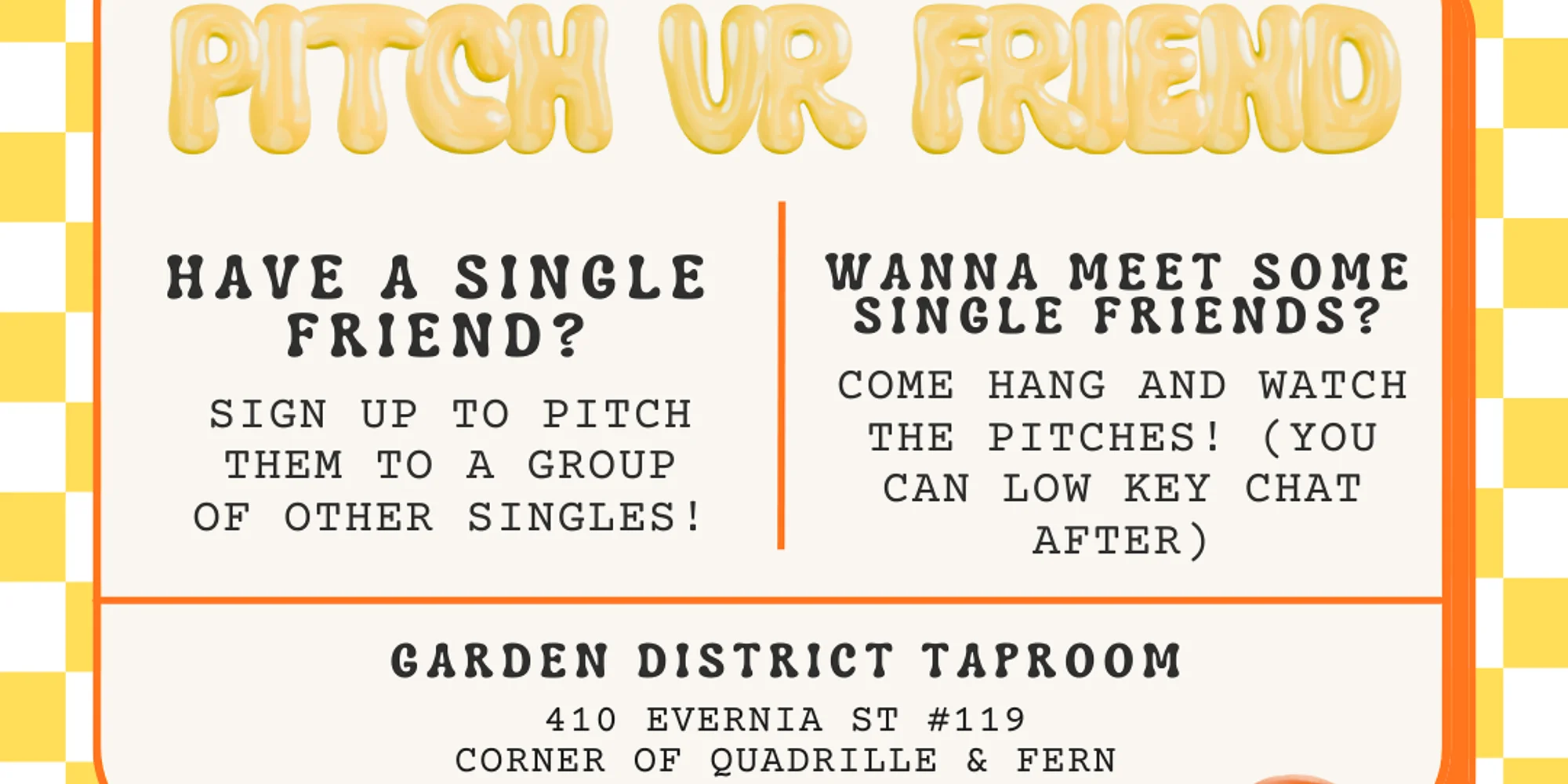 Looking for a new way to set up your awesome single friend? Come pitch them via slideshow to a room full of people! Space is limited. Sign up your single friend today!