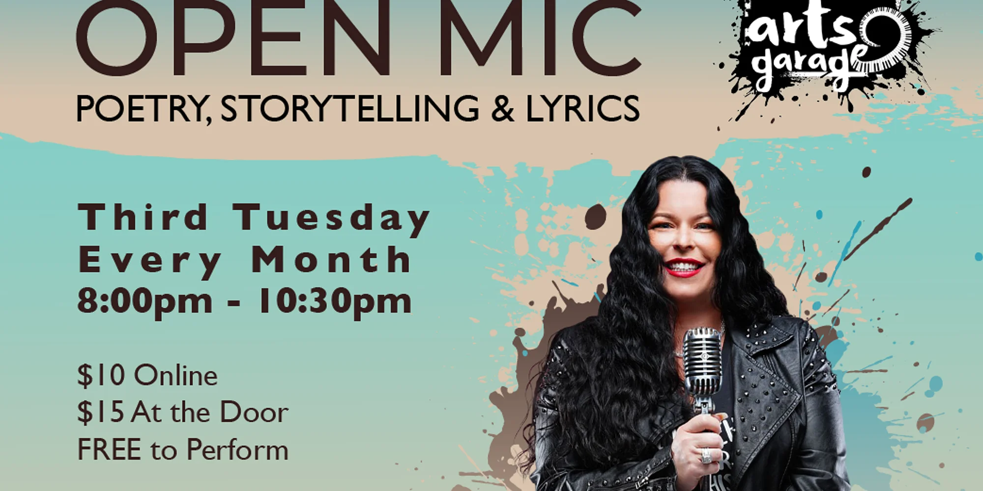 Inviting poets, storytellers & songwriters to share your original work with a supportive audience on the Arts Garage stage! Join us for Spoken Word Open Mic Night on the 3rd Tuesday of every month. Open Mic Guidelines Tickets purchased online: $10 Tickets purchased through the Box Office: $15 A QR code will be provided upon arrival to facilitate online ticket purchases. Performers: FREE – Performer registration begins at 7 PM and must be in-person. Sign up to perform upon arrival (must sign up by 9 PM). Signing up at 7:00 PM adds your name to the performer pool but does not guarantee stage time. Rather than a first-come, first-served approach, the host determines the order based on multiple factors to ensure a well-balanced show. We appreciate your understanding and cooperation. Performers are encouraged to sign up from their personal device or phone using a QR code provided that evening. We feature up to 24 performers per night. Each performer has a maximum of 3-5 minutes on stage. Be mindful of the stoplight cue. If you go over your time, your mic will be cut off and the host will take the stage. The host reserves the right to stop any performance that uses hate speech. Audience members may be asked to leave the event if the host or house manager deem it necessary. Equipment on stage is not to be moved. The host will adjust the microphone as needed. NOTE: Please double-check that you are selecting tickets for the correct date/month on the calendar. The date you select will show as green. TICKETS IMPORTANT TO KNOW: Restricted performance: 18 and older only. 21+ to drink with valid US ID or Passport required at the door.