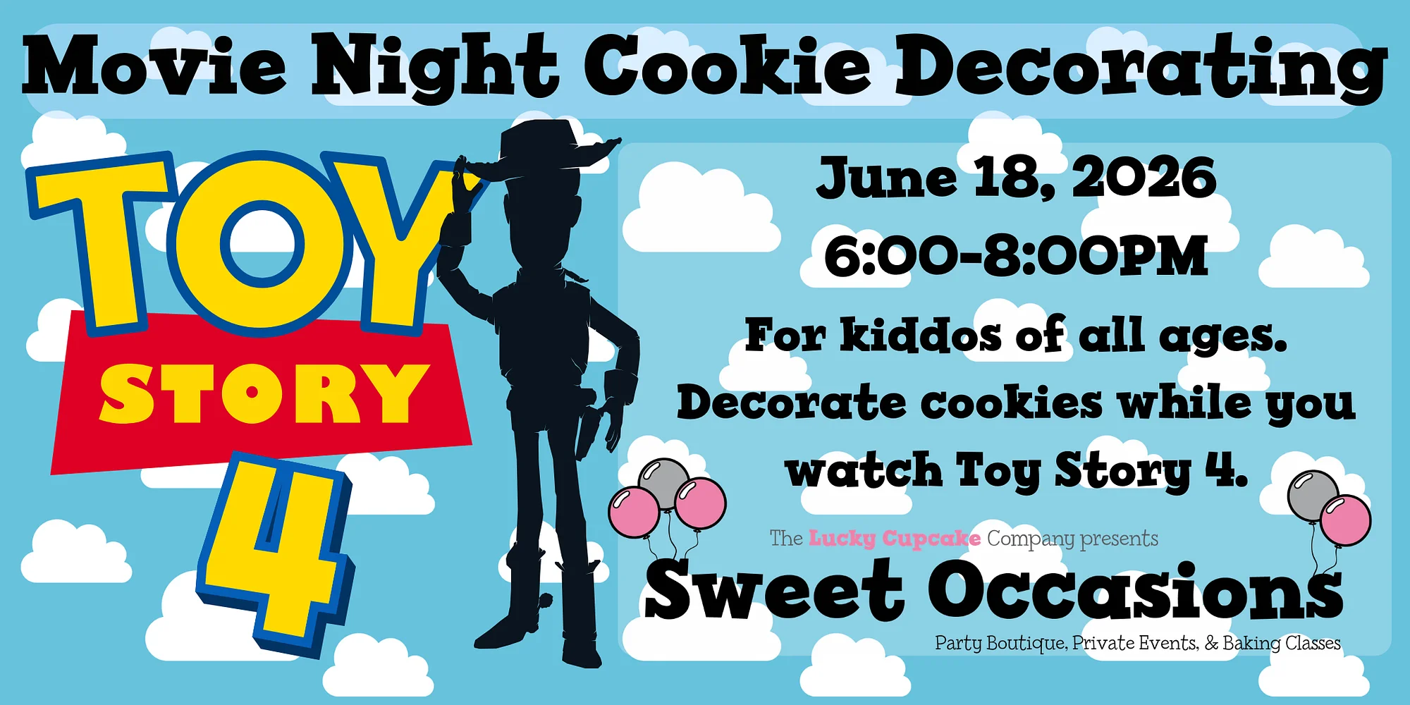 Join us for an extra sweet movie night! Watch Toy Story 4 while you decorate themed cookies and enjoy movie theater snacks! Join us on June 18 for an extra sweet movie night! Watch Toy Story 4 while you decorate Toy Story themed cookies and enjoy movie theater snacks. This in-person event is the perfect to enjoy with friends and family. Don’t miss out on this sweet opportunity to create lasting memories. All ages are welcome. Children under 15 must be accompanied by an adult One $36 ticket covers 1 Adult & 1 Child and includes: 2 undecorated sugar cookies, royal icing and plenty of sweets to decorate your masterpiece. Movie theater snacks also provided. We will be showing Toy Story 4 on our projector during the event. Purchase Tickets Event is held at Sweet Occasions (Shop 74 in Peddler’s Village). Please note that Sweet Occasions is not a handicap-accessible location. Questions: Email us at sweetoccasions@theluckycupcakecompany.com.