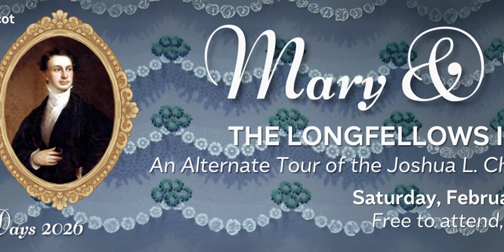 An Alternate Tour of the Joshua L. Chamberlain Museum As part of the month-long Longfellow Days celebration in Brunswick, PHC offers this unique look at the lives of the first famous couple to inhabit the house–Henry Wadsworth Longfellow and his first wife, Mary Potter. Offered at 11AM and 1PM on Saturday, February 14, this tour and talk focuses on Longfellow’s origin story–how he developed into the world-famous poet he became–thanks in large part to the relationship he had with his first wife. The tour is led by author and researcher Gemma Cannon, with Chamberlain context provided by Pejepscot History Center staff member. Gemma, a grief specialist and author of Voices of the Night, uses the Longfellows’s story, HWL’s poetry, and other 19th century voices to help people live with grief. Gemma has discovered rich new material about Henry’s first wife, and more than we ever knew about Henry’s early writing. The tour is approximately 60-75 minutes. Each of the two sessions is limited to 15 people. FREE but registration required. To register, send an email to info@pejepscothistorical.org with the subject heading “Longfellow Days House Tour.”