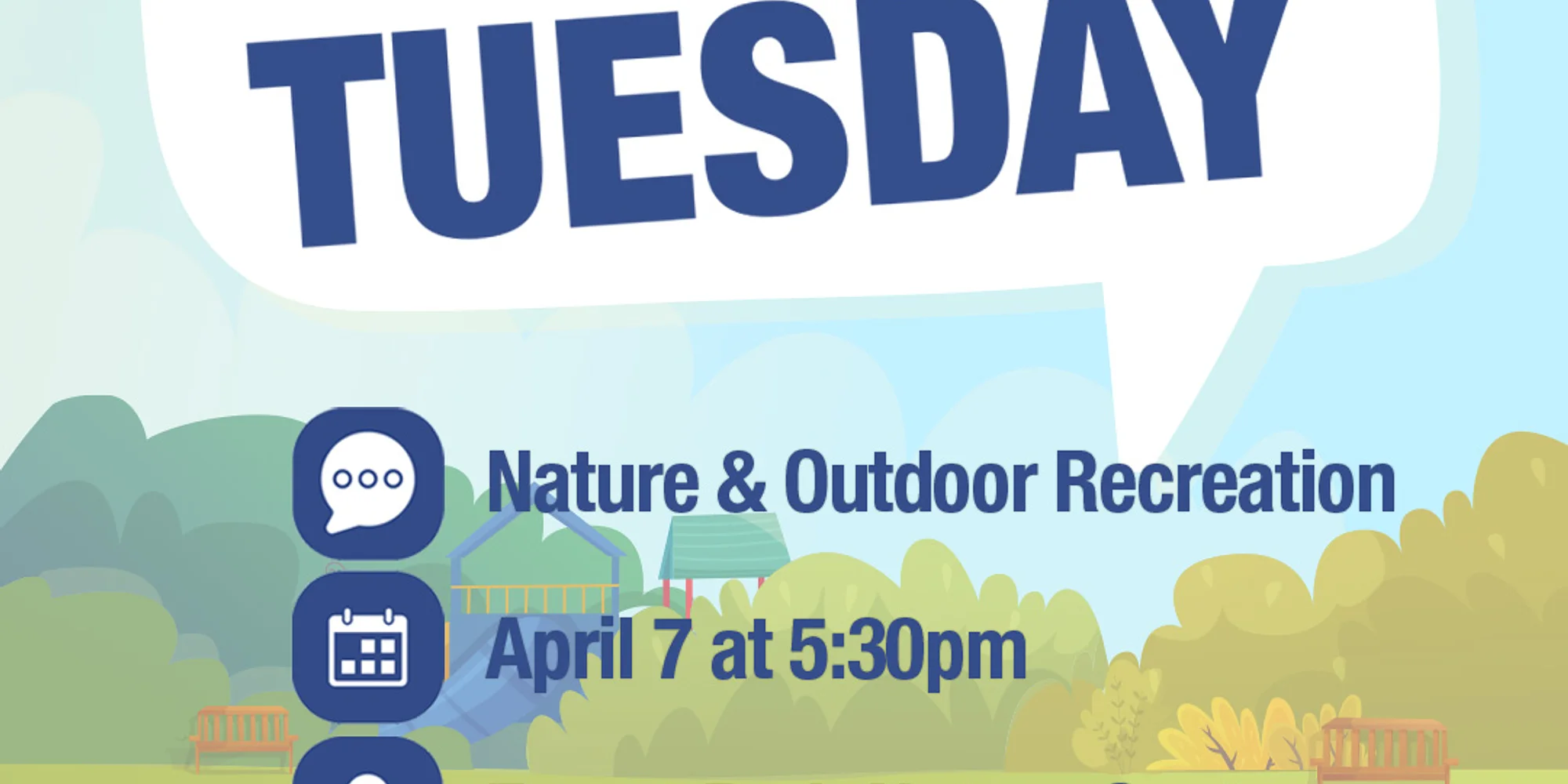 Join the Peoria Park District for Talk About It Tuesday as we explore Nature & Outdoor Recreation this month. Location: Forest Park Nature Center Date: April 7 at 5:30pm Join us to discuss outdoor recreation opportunities, natural spaces, and programming throughout the District! One lucky attendee will win a Forest Park Nature Center membership! These monthly gatherings are your chance to connect directly with the Peoria Park District Board of Trustees, ask questions, share ideas, and discuss topics that matter to you—all while learning more about the District’s programs and spaces. Can’t attend in person? We still want to hear from you! Click here to share your feedback. Want to see what’s coming up? Click here to view the full Talk About It Tuesday schedule.