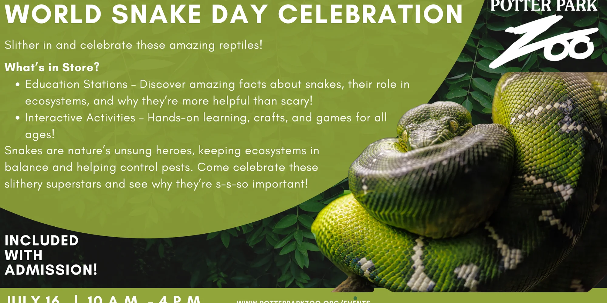 Celebrate World Snake Day at Potter Park Zoo! Slither into Potter Park Zoo July 12, 2026, for World Snake Day—a celebration of these incredible, misunderstood reptiles! This event is included with standard zoo admission. What’s in Store? Education Stations – Learn fascinating facts about snakes, their role in ecosystems, and why they’re more helpful than scary! Interactive Activities – Enjoy hands-on learning, fun crafts, and games for all ages. Snakes are vital to the environment, helping control pest populations and maintaining balance in nature. Join us to celebrate these slithery superstars and discover why snakes are s-s-so important!