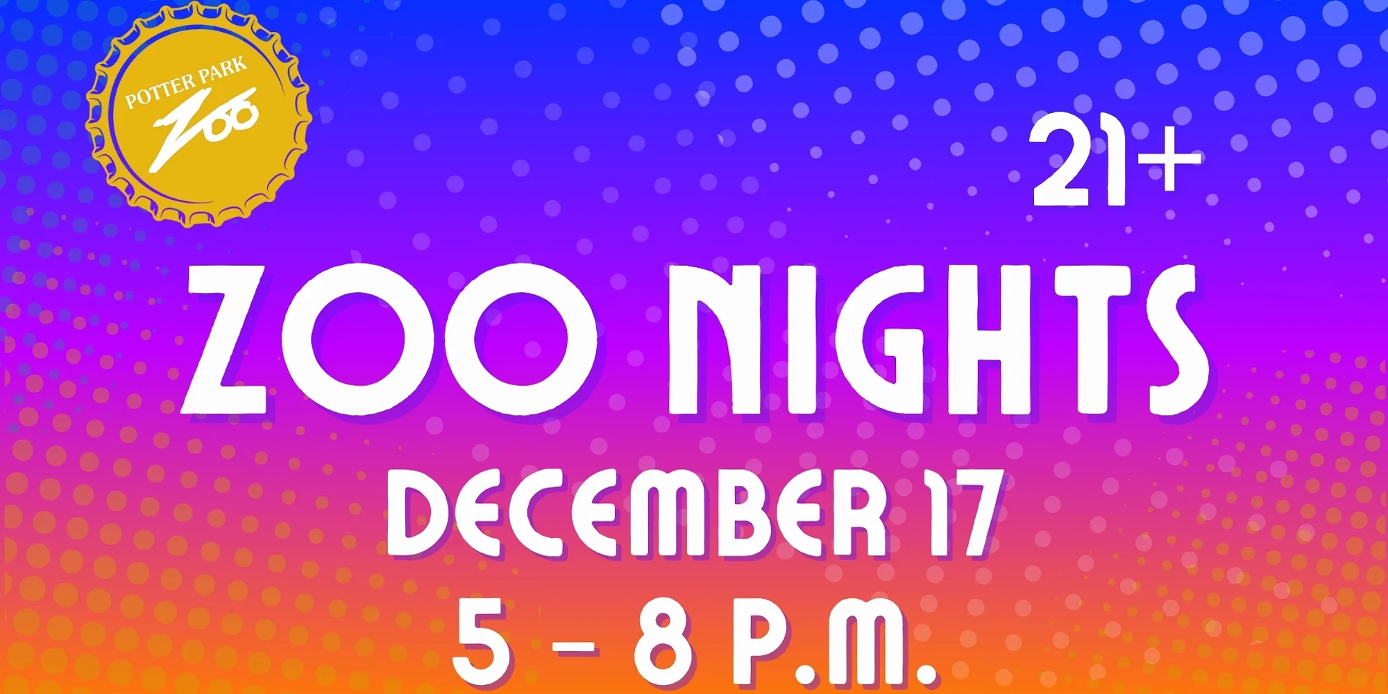 Join us at Potter Park Zoo Dec. 17, 2025, from 5 p.m. to 8 p.m. for Zoo Nights with Lights! Purchase tickets in advance by calling 517-342-2713 or in-person at our Discovery Center Front Desk. Get ready to bundle up and experience the magic of the season in a whole new way. This special evening, exclusively for our 21+ guests, offers a delightful happy hour-style gathering that combines holiday cheer with a touch of wildlife wonder. Please note that due to limited space- All V.I.P ticket amenities are still available, but they will be shifted to flow better with the event! Volunteers and event staff are happy to help! TICKET PRICES: Standard Non-Member: $25 Standard Member: $20 VIP Non-Member: $40 VIP Member: $35 Designated Driver Non-Member: $25 Designated Driver Member: $20 THE DETAILS: