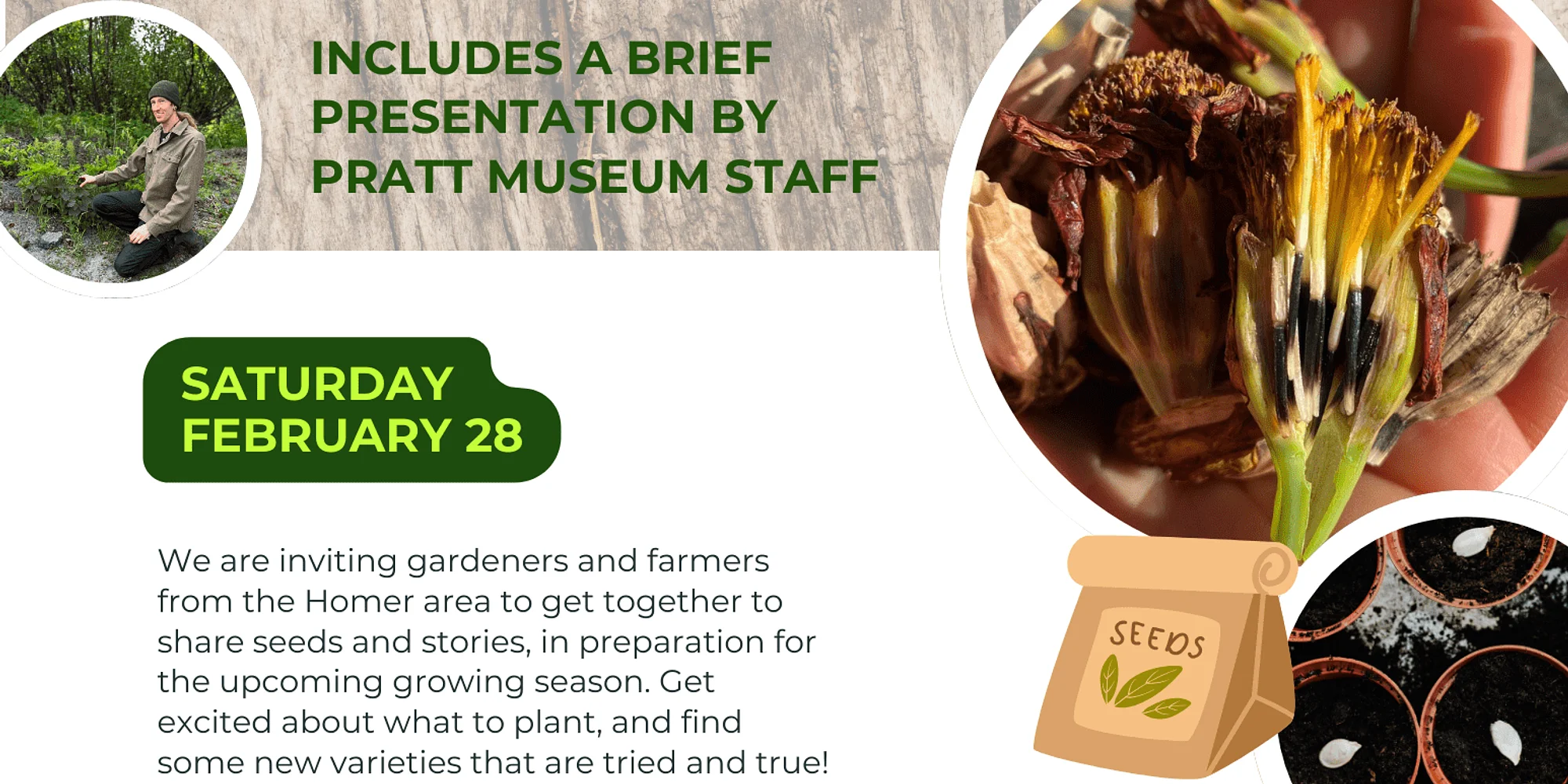 Community Seed Swap | Mark your calendars for Saturday, February 28 from 3 – 5pm at the Pratt Museum. Get ready for spring at a Seed Focused Event at the Museum! We are inviting gardeners and farmers from the Homer area to get together to share seeds and stories. Get excited about what to plant, and find some new varieties that are tried and true! Don’t forget to bring seeds to exchange with other plant lovers. These can either be seeds you’ve saved yourself, have bought, or simply have extra of. This event is FREE to attend, and will include a brief presentation by Pratt Museum Botanical Garden Staff.