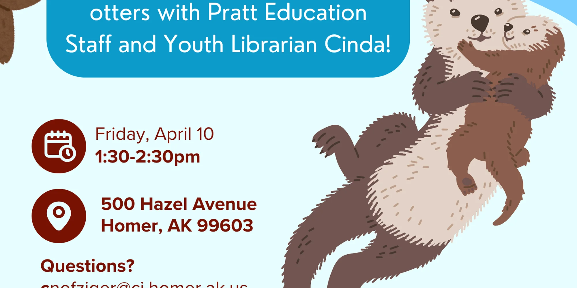 SEA OTTERS AT THE LIBRARY Friday, April 10 | 1:30 – 2:30 pm Join Pratt Education Staff and Youth Librarian Cinda to learn all about sea otters. This Early Release Day Program will be held at the Homer Public Library. This is a FREE event but registration is required. https://www.cityofhomer-ak.gov/library/otters-library This event is intended for elementary aged kids. The program is part of a series of collaborations between the Homer Public Library and the Pratt Museum. Events for school aged youth will take place on KPBSD early release days throughout the school year.