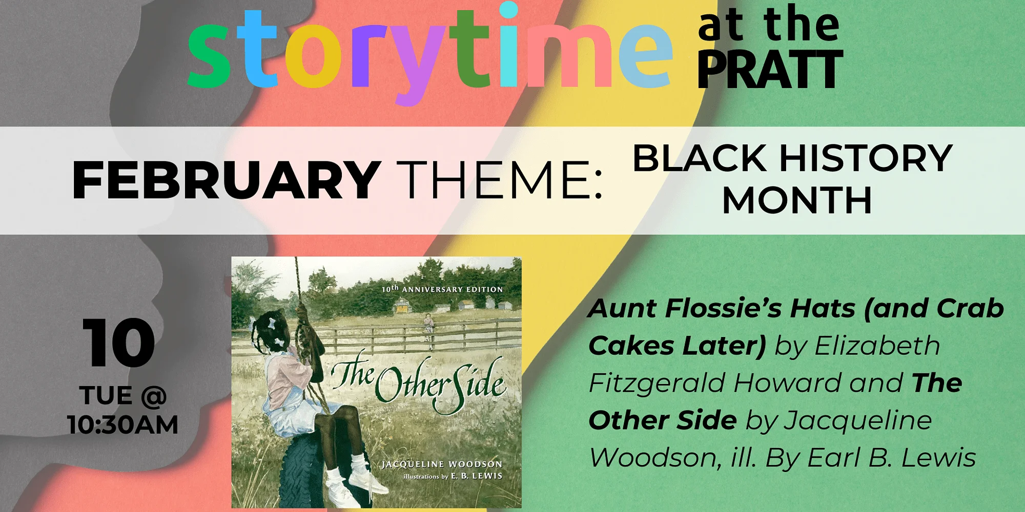 Storytime at the PRATT: Black History Month Tuesday, February 10 | 10:30am | no cost | age 3-10 This week, stop by to hear staff read Aunt Flossie’s Hats (and Crab Cakes Later) by Elizabeth Fitzgerald Howard and The Other Side by Jacqueline Woodson, ill. By Earl B. Lewis. Storytime is a weekly event! Join us to read a story with a Pratt Museum Staff member, tour the galleries, and participate in an activity or craft. Questions? CONTACT the Museum’s Education Staff – education@prattmuseum.org