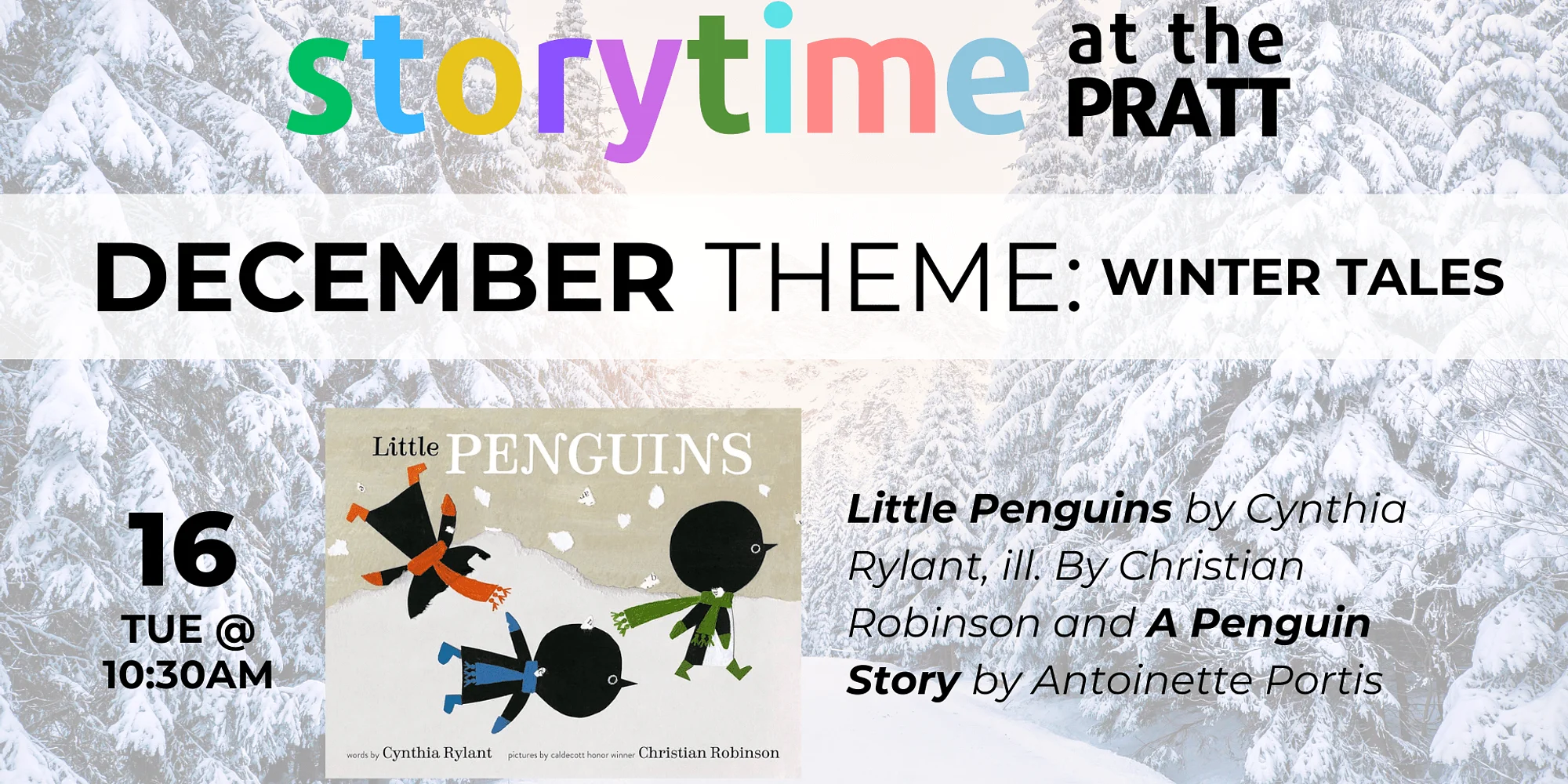 Storytime at the PRATT: Winter Tales Tuesday, December 16 | 10:30am | no cost | age 3-10 This week, stop by to hear staff read Little Penguins by Cynthia Rylant, ill. By Christian Robinson and A Penguin Story by Antoinette Portis. Storytime is a weekly event! Join us to read a story with a Pratt Museum Staff member, tour the galleries, and participate in an activity or craft. CONTACT Maghan Monnig, Education & Public Programs Manager, tel (907) 435-3334, education@prattmuseum.org