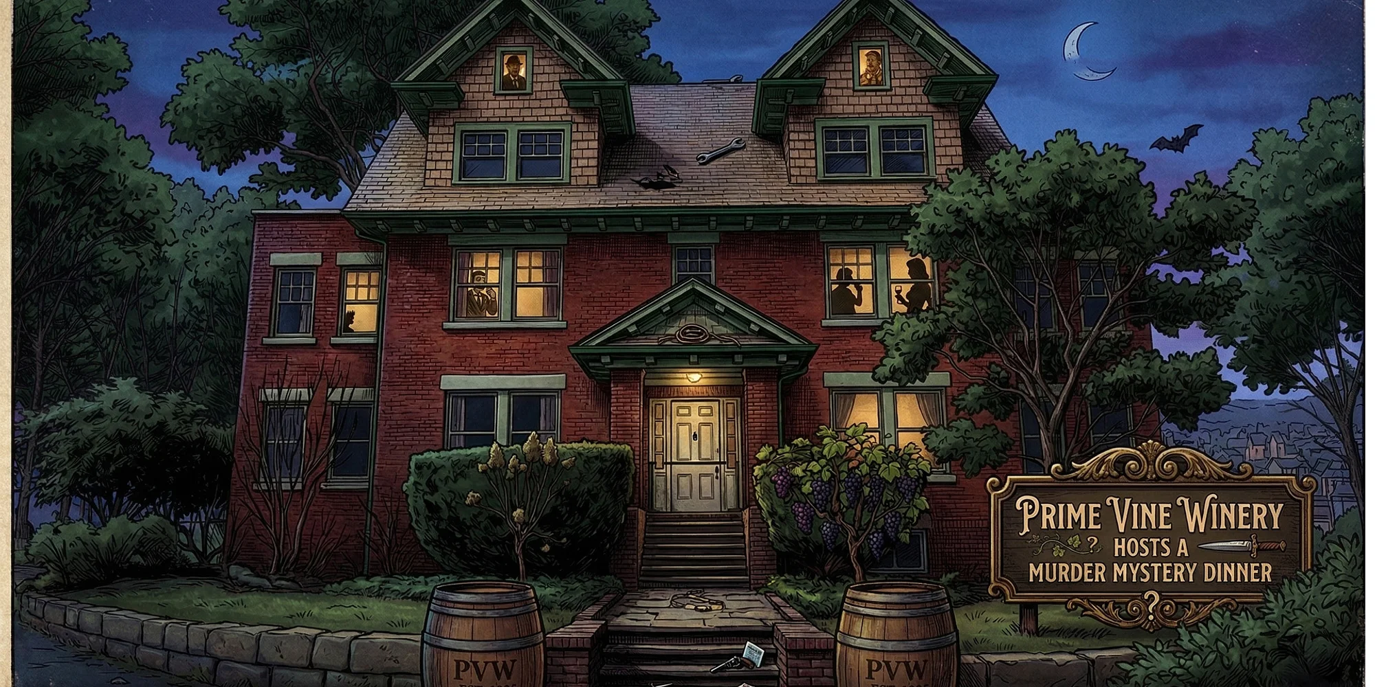 Whodunit? A Speak Easy of Murder It’s 1928. The gin is flowing, the jazz is loud, and somebody at this table isn’t who they say they are. Mobster and bootlegger Danny “Lucky” Campisano is throwing the grandest speakeasy bash New Franklin has ever seen — right inside the Prime Vine Mansion. He’s even sprung for a case of “imported” gin. The problem? Someone poisoned it. And the killer is sitting at your table. As the drama unfolds around you with our live actors, you’ll work through a seven-course feast, each plate paired with one of Prime Vine’s signature wines — because even in the middle of a murder investigation, good food and great wine deserve your full attention. This isn’t a dinner. It’s an experience you’ll be talking about on the way home. The Killer Lineup Tandoori Lamb Meatballs (GF) General Tso’s Chicken Thighs Portobello Mushroom Satay (V) Roasted Redskin Smashed Potato Carbonara (V) Winter Sausage Medallions (GF) Smoked Brisket over Creamy Mac & Cheese with Texas Twang BBQ Cherries Jubilee with Vanilla Honey Cake All dishes served with fresh, seasonal garnishes. Exclusive wine pairings with each course Come for the mystery, stay for the wine, and try to make it to dessert alive! $149 per person | Saturday, May 9 · 5:00–9:00pm Prime Vine Winery Mansion · 4332 Manchester Rd, New Franklin, OH Seats are limited — and they go fast. Once the guest list is set, the case is closed. Reserve Your Seat Now → Questions? Call us at (330) 807-1317 — we’re open Wednesday through Saturday, 3–9pm. Host Your Own Night of Intrigue If tonight got you thinking — we could do something like this for our group — you’re right, you absolutely could. The Prime Vine Mansion is available for private events, corporate dinners, milestone celebrations, and custom experiences. Historic setting, stunning grounds, and a wine program that makes every gathering feel like a proper occasion. Let’s Plan Your Event →