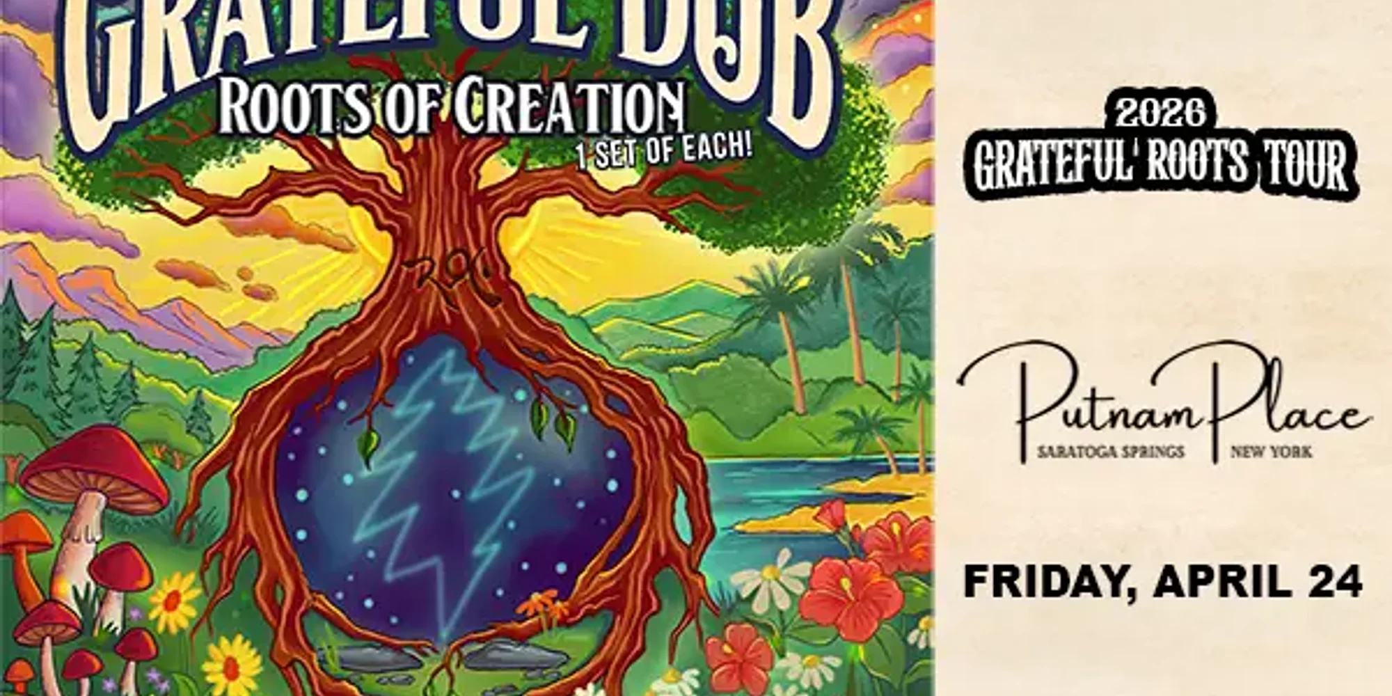 Doors: 7:30pm Show: 8:30pm Ages: 18+ Tickets: $20 Advance / $25 Day of Show ** Click Here to Purchase Tickets ** RoC (Roots of Creation) has taken on a unique new project: Grateful Dub: a Reggae-infused tribute to the Jerry Garcia & The Grateful Dead. Combining their longtime love for Reggae-Dub style music and the Grateful Dead, RoC reworked some of the world’s favorite Dead tunes into a new studio album. RoC had the pleasure of working in the studio with the legendary 5-time Grammy winner Errol Brown who was Bob Marley’s sound engineer for this project. Grateful Dub is also being performed live in its entirety at festivals, theatres, and clubs around the country, and features rotating live special guests that has included Melvin Seals (Jerry Garcia Band), Scott Guberman (Phil Lesh), Zach Nugent, RyMo, AG, & Paul W. (Slightly Stoopid), G. Love (G. Love & Special Sauce), Mihali (Twiddle), Dan Kelly (Fortunate Youth) and others. Grateful Dub captures the spirit and magic of the Grateful Dead, while laying it down Reggae-Dub style. Roots of Creation will also open the show with an original set of music. Roots of Creation Billboard and radio chart topping, award-winning, international reggae-rock sensation Roots of Creation, are a touring powerhouse. Whether on the festival circuit, performing at jam and reggae-rock favorites like Camp Bisco, Gathering of The Vibes, California Roots, Jungle Jam and Closer to the Sun, or sharing the stage at sold out shows with some of their diverse influences including Slightly Stoopid, The Wailers, and Michael Franti, reggae/rock/dubtronica band Roots of Creation (RoC) offers up a high-energy, infectious live music experience. Their mix of reggae riddims, conscious lyrics, spirited horn lines, and electronic beats makes crowds move and has their loyal underground fan base (RoC Family) and street team (Universal Soldiers) travelling the distance to pack venues from coast-to-coast. Roots of Creation’s most recent release, Livin Free, debuted No. 1 on both the Billboard Reggae and the Relix/Jambands.com Radio charts. Livin Free is a triple record that includes three versions of each song–studio, dub, and acoustic that features guest performances by Melvin Seals (Jerry Garcia Band), Marshall “Ras MG” Goodman (Sublime, Long Beach Dub Allstars), the Rubblebucket horn section, Billy Kottage (Reel Big Fish), Grammy-nominated Pato Banton (Sting, UB40), and many more. Additionally, the album welcomes guest production by Yeti Beats (Rebelution, Slightly Stoopid). Website: www.rootsofcreation.com Return to Calendar