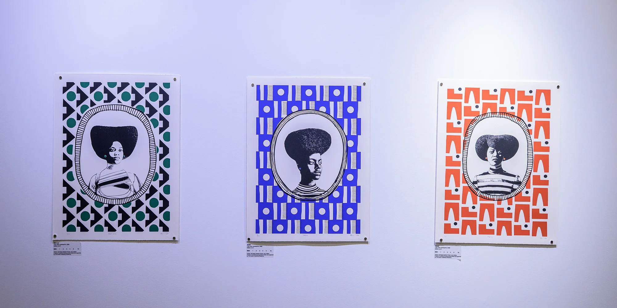 In the Helen C. Frederick Gallery Works by Hadiya Williams Curated by Anika Hobbs On View January 23–March 29 (View the online gallery) Artist Talk Saturday, February 14 | 12pm (RSVP) Featuring hand pulled prints, 32 AI generated giclees, ceramics, and textiles, Pyramid’s gallery will be layered with color, texture, and patterns as it showcases work by the multifaceted Artist Hadiya Williams. Curated by Anika Hobbs, OFFLINE invites viewers to consider how materiality, memory, and technology together expand the possibilities of modernism itself. Williams and Pyramid have collaborated to create three hand-pulled limited edition screenprints and one letterpress print as part of Pyramid’s Denbo Publishing program. These new prints join Williams’ digitally printed work, hand cut paper images, and ceramics. Each piece is a visual bridge between mid-century modernist language and Afro-diasporic design traditions. Patterns, textures, and structures drawn from Black cultural archives are reconfigured through digital tools, then re-embodied by hand—asserting the tactile presence of Black creativity in a world increasingly mediated by code. Hadiya Williams is an artist and designer with over two decades of professional experience in graphic design. She earned her BS from Bowie State University and a BFA from Columbia College Chicago. In 2017, she transitioned from a successful career in graphic design to focus on handmade ceramics, surface design, and generative art. Hadiya is the founder and creative director of Black Pepper Paperie Co.®. Her work draws inspiration from West African art forms, the Black Arts Movement, and the graphic styles of the 60s and 70s. Her work is in permanent collections at the National Museum of African American History and Culture and the National Trust for Historic Preservation. Hadiya has collaborated with brands such as F. Schumacher & Co., Esembly Baby, Nubian Hueman, and Lulu & Georgia bringing her creative perspective to audiences worldwide. Grounded in her personal and cultural history, Hadiya’s artwork celebrates what it means to be a Black woman in this world while exploring modern interpretations of art and design. Image: (L-R) “Ora Lee”, “Sadie”, and “Hepsy” by Hadiya Williams. 24×18″, Two color screenprints