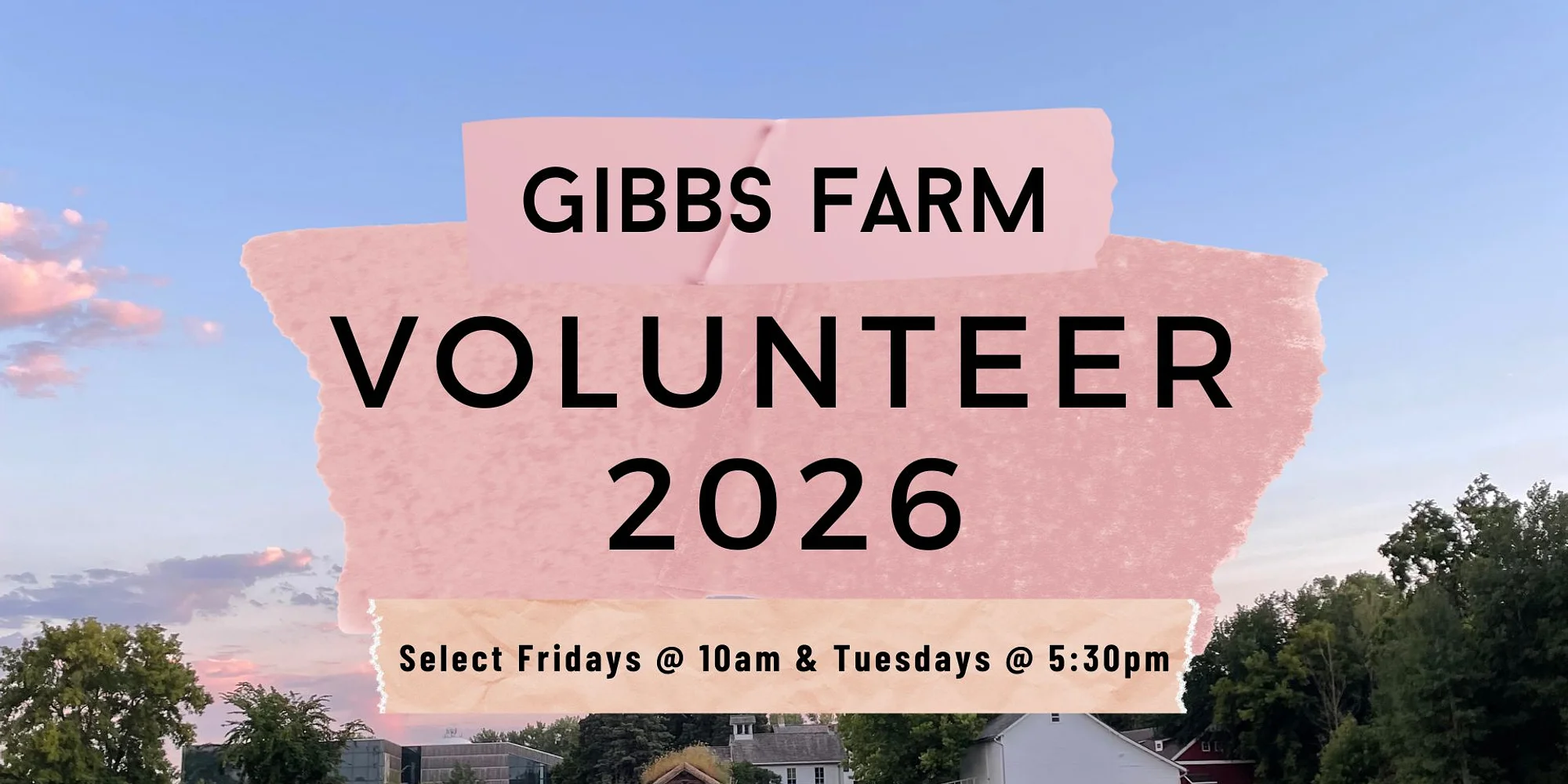 2026 Volunteer Days Gibbs Farm Select Friday Mornings at 10:00AM and Tuesday Evenings at 5:30PM Free to Sign Up Help us tackle our to-do list! Volunteer at Gibbs Farm on select Friday Mornings and Tuesday Evenings during the 2026 season. The outdoor projects change weekly usually planting, watering, weeding, harvesting, light landscape and orchard projects. Register Here Projects are best for ages 6+ and are great for students, families, small groups (workplace teams, clubs, scouts, 4-H ect.) and individuals. Children under 12 should sign up with an adult. No experience necessary! Projects will be lead by Gibbs Farm staff and all supplies, materials and instructions are provided. Have a question or need to cancel your registration? Email Clare @ RCHS.com. Day of Instructions: Volunteers should park in the Gibbs Farm public parking lot of Cleveland Ave and enter the site through the wooden gates, Clare will meet you there! Please wear close-toed shoes and clothes you can work in. There are bathrooms and a drinking fountain with water bottle filler on site.