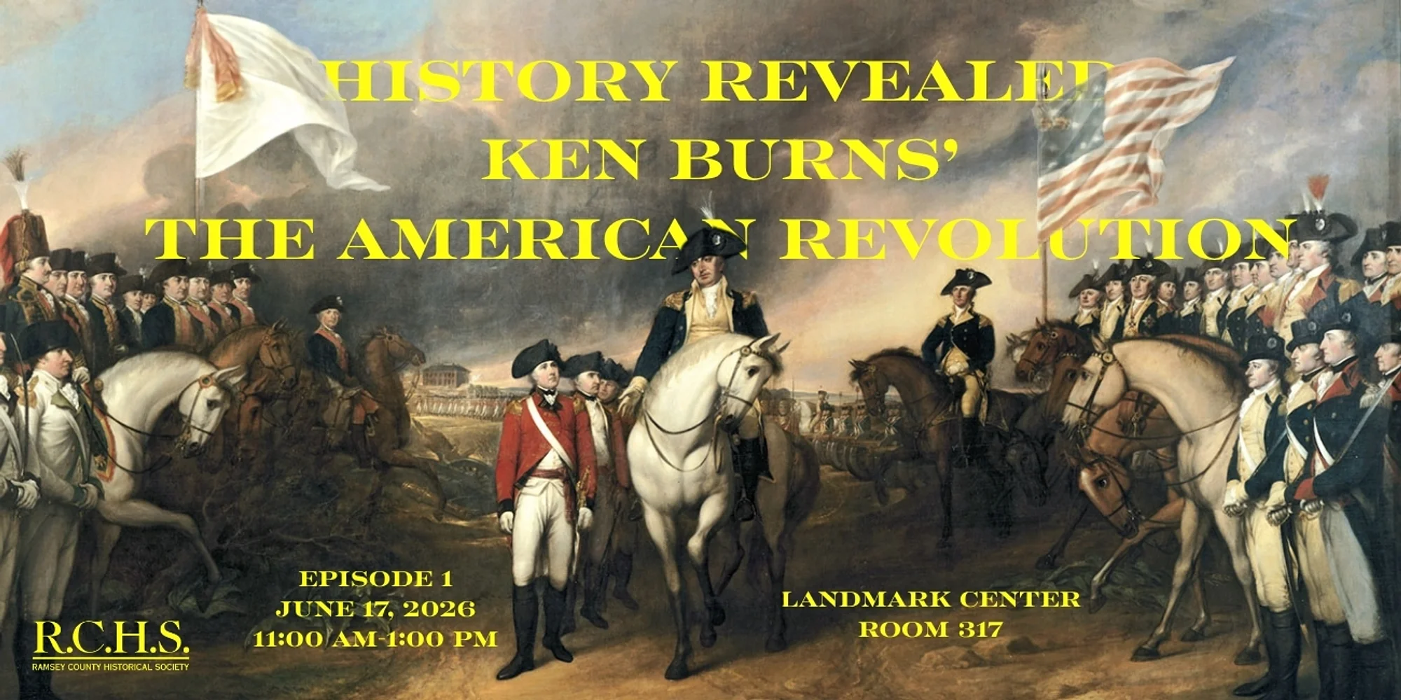 History Revealed – Ken Burns’ The American Revolution Ep. 1 Landmark Center, Suite 317, 75 West 5th Street, St. Paul, MN 55102 Wednesday, June 17, 2026 11:00 AM-1:00 PM Event is free, but registration is required. REGISTER Join the Ramsey County Historical Society for a special community screening of the first episode of The American Revolution by acclaimed filmmaker Ken Burns. Held in the historic Landmark Center, this event invites you to experience the powerful storytelling and rich visuals that bring the nation’s founding era to life. Following the screening, guests are encouraged to reflect, connect, and discuss the enduring impact of the Revolution. Don’t miss this opportunity to engage with history in a meaningful and inspiring setting. This event is part of a series of showings with TPT, Dakota County Historical Society, Hennepin History Museum, and Minnesota Historical Society.
