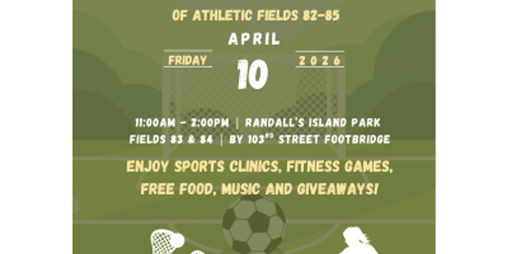 Kick off the spring sports season with the Randall’s Island Park Alliance at our 80’s Fields Community Field Day! We’re celebrating the reopening of our newly restored athletic fields and inviting families and kids to come play, explore, and enjoy a fun-filled day outdoors during Spring Recess. This free, family-friendly event will feature sports clinics, games, music, food, and plenty of ways to get active. Enjoy the new fields, connect with local recreation providers, and spend the day playing and celebrating with your community. Randall’s Island Park is a place for youth sports and outdoor fun all year long. Join us to celebrate the 80’s Fields reopening and the start of a fun, active spring season! Location: Athletic Fields 83 & 84 For inquiries about accessibility, to request an accommodation or for event information, please email publicprograms@randallsisland.org.