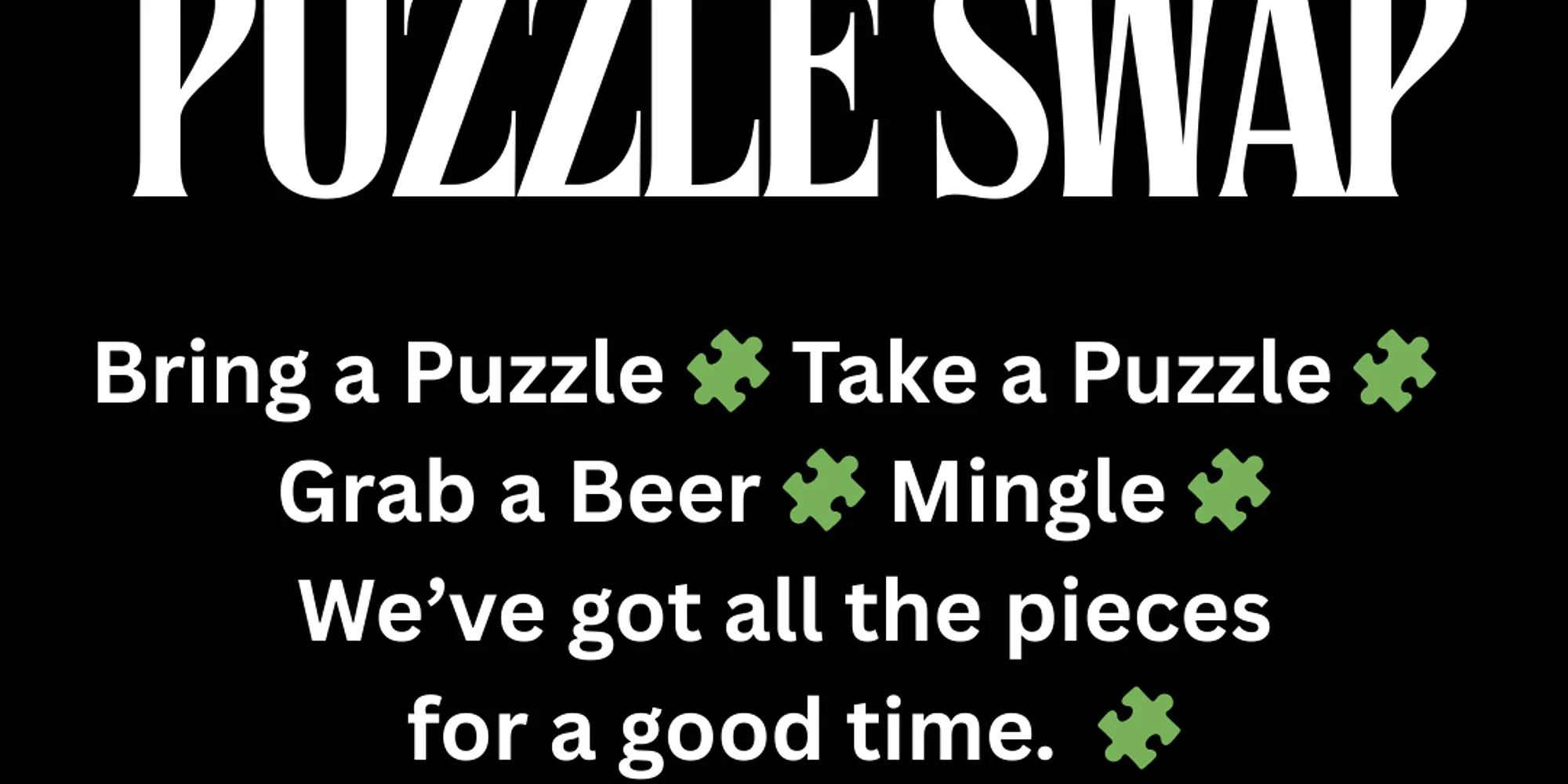 Bring a puzzle. Take a puzzle. Grab a beer. Mingle. Kombi Pizza serving 12:00 to 8:00.