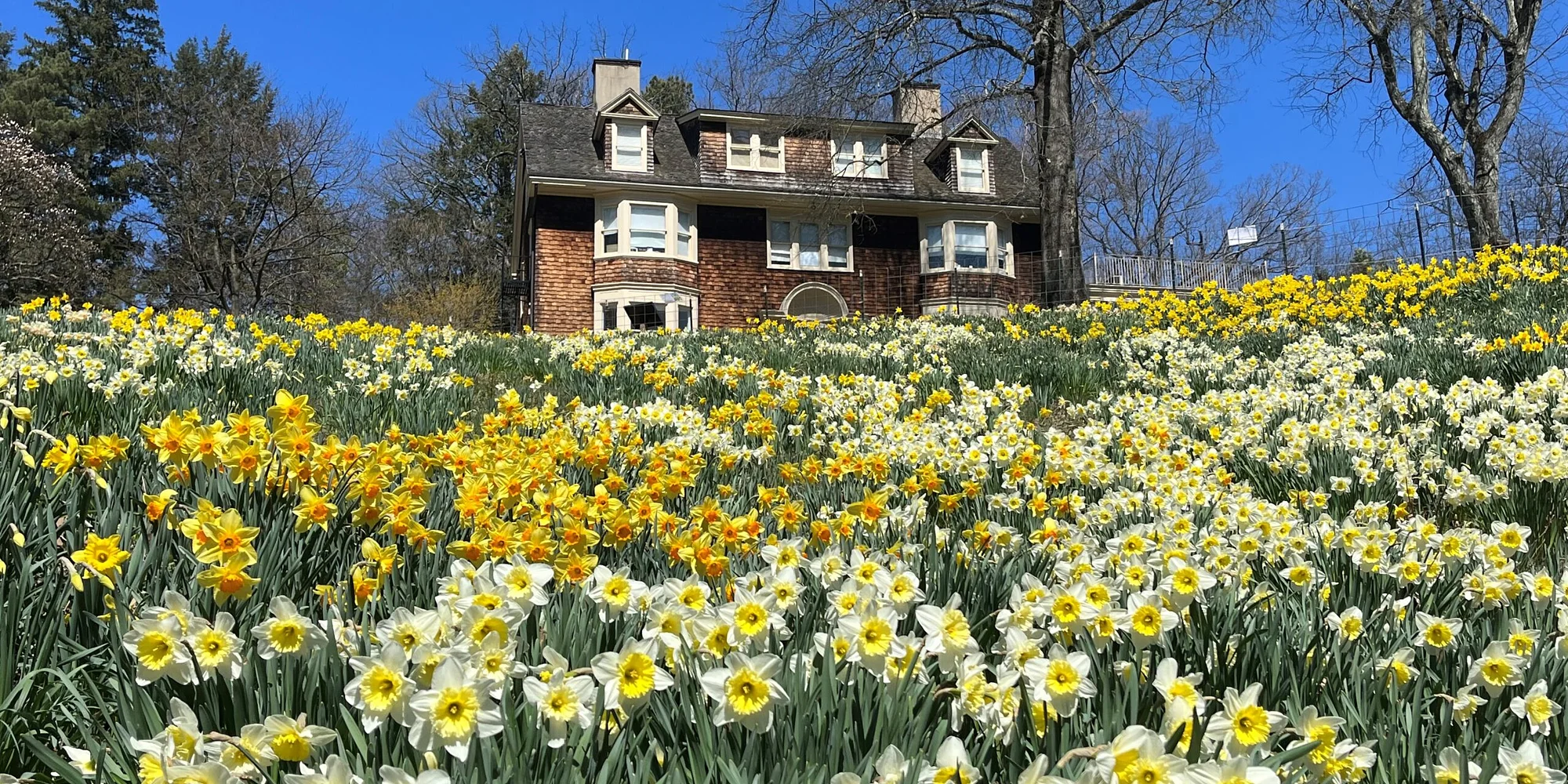 Can’t make it to our Daffodil Day Festival on Sunday, April 12? Celebrate the beauty of spring at Daffodil Days, April 1-15 from 9 am to 5 pm (excludes Sunday, April 12). Wander through a breathtaking display of 50,000+ daffodils in full bloom, creating a sea of golden hues in our cherished Daffodil Bowl. In an effort to preserve and replenish this stunning floral showcase ensuring its beauty for years to come, we will be collecting a $10 per person entry fee during this time. This entry ticket includes access to the Daffodil Bowl, entire grounds, and the current Wisner House art exhibit that is open Tuesday – Sunday, 10 am – 4 pm. Reeves-Reed Arboretum members and children under 10 are free. Don’t miss this annual celebration of nature’s renewal – bring your friends and family for a picture-perfect springtime stroll! Registration: We highly recommend registering in advance. This will expedite check-in and ensure entry during this busy time. Please have your confirmation email with you or on your phone when you arrive. If the entry cost is a barrier, please contact us at info@reeves-reedarboretum.org to inquire about donor-supported entry tickets. Photography: All visitors and photographers must stay on the marked trails! Please note that amateur photography, including personal cell phone photography is allowed. Professional Photography, Social Media Influencer, and Portrait Photography require a permit and must be booked in advance. Click here for details. Parking: Street parking only is available. Reeves-Reed Arboretum is located within a suburban neighborhood so please respect the parking regulations posted and the property of our neighbors. Please carpool during this busy season if possible. Thank you! Notice: Due to ongoing construction for the Path for All project, Arboretum parking will be unavailable Monday through Friday, from 8:00 AM to 5:00 PM. Please use street parking during these hours. Handicap parking will remain available.