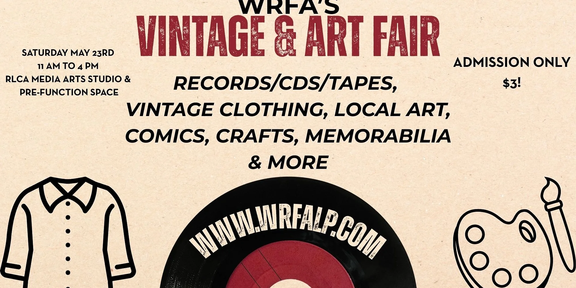 Reg Lenna Media Arts Studio - 108 E. 3rd St. - Jamestown WRFA is transforming The Reg Lenna Media Arts Studio and the Pre-Function Space into a Vintage & Art Fair! Vendors will be selling vintage favorites like vinyl, clothing and comic books and we'll also have local artists selling their work Interested in being a vendor?! 6 Foot Table Spaces are available for $25 per spot* 3 Foot Round Table Spaces are available for $15 per spot* *ARTISTS AND VENDORS MUST BRING THEIR OWN TABLES (very limited amount of tables will be available for rent) Vendor fees and admission will go towards WRFA and keeping community radio on YOUR airwaves! REGISTER NOW