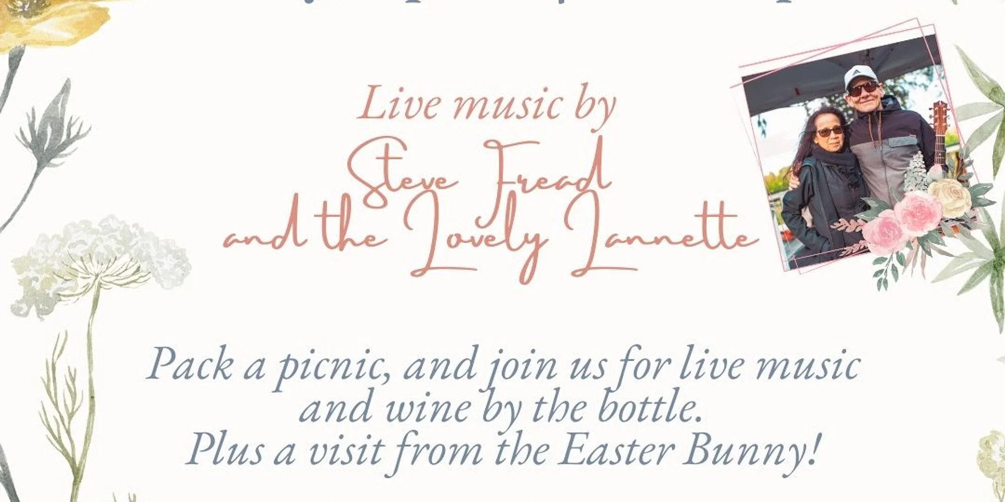 @ Our Annual Easter Picnic Picnic at Retzlaff Vineyards this Easter with wine, live music, and the Easter Bunny! Kids welcome. Advance purchase recommended. Savor your favorite Retzlaff wines, sway to live music by Steve & Lanette, all while surrounded by the scenic beauty of our vineyards and tree-lined grounds. Event Details: Date & Time: Easter Sunday, two picnic seatings: 12:00 – 2:00 PM and 2:30 – 4:30 PM Location: Retzlaff Vineyards Live Music: Steve & Lanette Fread Enjoy wines by the glass and by the bottle on our lovely picnic grounds. (Wine tasting will resume April 11th) Reserve with the button below. Select “Picnic Table and Seating Reservations” (or “Wine Club Picnic Reservation” if a Retzlaff Wine Club member), then the April 5th date for your choice of Easter Picnic time slots. Reserve Picnic NEW Easter Picnic Pricing: Wine Club Members: Complementary for up to 6 persons (1 table per member) Non-Members: $5 per person (adults + children ages 1+. Babies no charge) Be sure to select “Picnic Table”, April 5th for your Easter Picnic Time slot Your Picnic Experience Includes: Picnic table seating, with some smaller tables or barrel tables. You’ll be directed to larger or smaller tables based on your group size when you arrive. Got a group of 13 or more? Email us at reservations@retzlaffwinery.com Minimum wine purchase: 1 bottle for every 2 adults Bring your own picnic food (note: No on-site catering will be available) Important Information: Children are welcome! (Ages 1+ are included in the seating count) Seating is limited and this event will sell out in advance – reserve your spots early! Well behaved dogs on leashes are always welcome. No outside alcohol allowed. Don’t miss out on this special event – book your spots before they’re all gone! Reserve Now Steve & Lanette Fread Steve Fread plays classic rock and popular hits from all decades and genres, accompanied by his lovely wife Lanette. Together, they provide a great soundtrack to a great day in the vineyard. Add to calendar Google Calendar iCalendar Outlook 365 Outlook Live