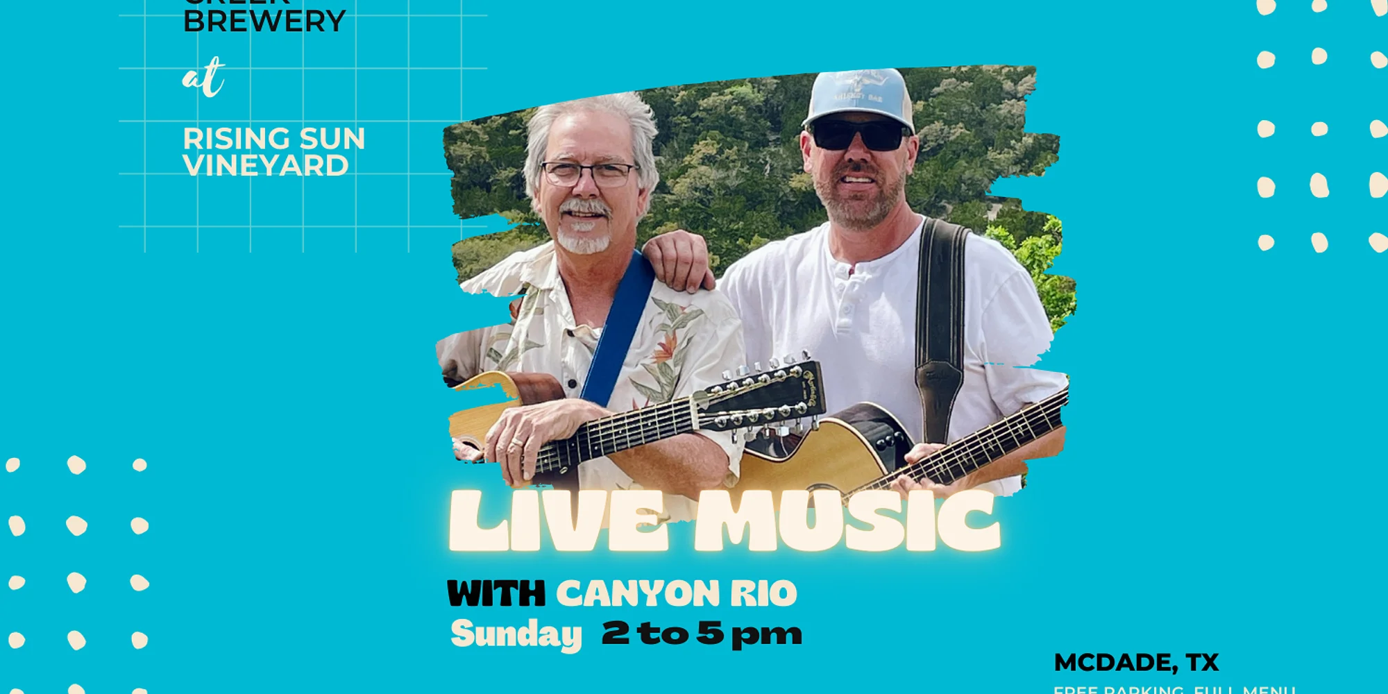 Canyon Rio consists of brothers-in-law Billy Tice and Wes Rader. Billy lives at Canyon Lake, and Wes along the Colorado River just outside Smithville. Thus the name Canyon Rio. Both hail from Houston, where in a previous century they played in various country and classic rock bands with friends and family. They have collaborated on a number of original songs, and continue songwriting as part of their musical journey. Since moving from Houston, Billy and Wes have teamed up to form Canyon Rio, and have been playing locally at venues in Smithville, Bastrop, and the Canyon Lake area for the past several years. You will hear classic country, modern country, outlaw country, folk, Americana, standard hits from across the decades, and original songs, all included in their live performances. Billy and Wes have two distinct styles when it comes to singing and guitar playing, and when performing together these have proven to blend nicely to offer something that everyone can relate to and enjoy!