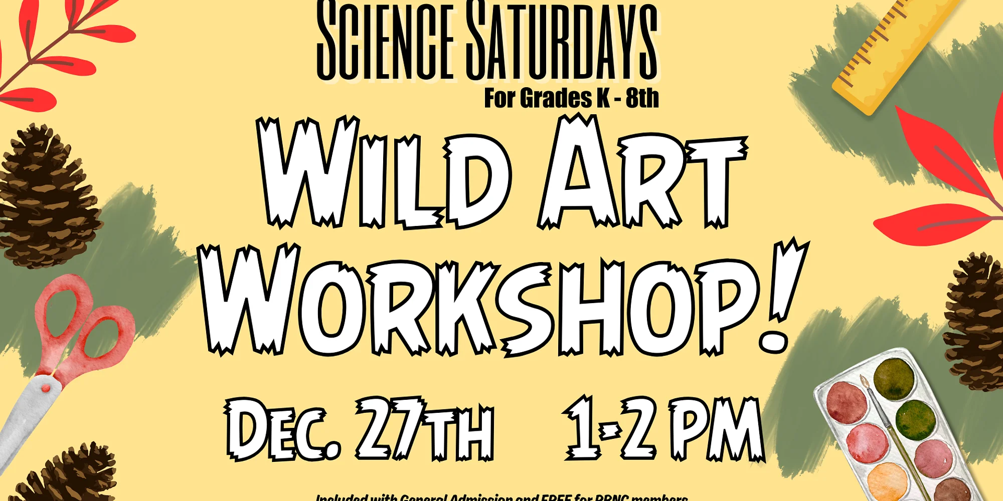 @ Join us on Saturday, December 27th, from 1 pm to 2 pm for our Science Saturday program, Wild Art Workshop! Explore the trail for nature’s art materials Collect leaves, sticks, berries, and more Turn your discoveries into unique artwork This program is for ages K-8th and is included with general admission. Science Saturday begins at 1 pm, and it is not a come-and-go program. General admission: $6, Children/Seniors/Military/Students: $5, and Children 1 and Under and RBNC members are free. Do you want free admission for all of River Bend’s weekly programs, discounts on birthdays, camps, special events, and in our Nature Gift Shop? You get these perks and more by being a member of River Bend! Visit https://www.joinit.org/o/river-bend-nature-center to become a member today! Add to calendar Google Calendar iCalendar Outlook 365 Outlook Live