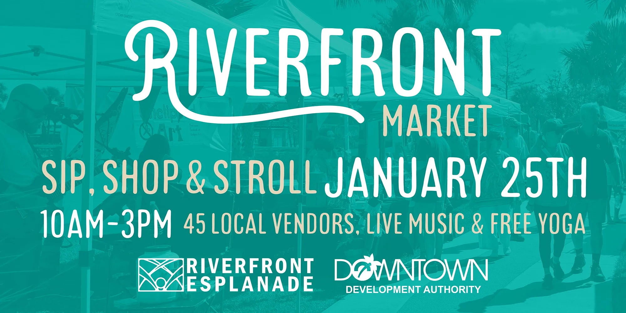 THIS MARKET WAS RESCHEDULED FROM JAN 18TH TO JAN 25TH DUE TO WEATHER ✨ Join us for a perfect Sunday at the Riverfront Market in Downtown Daytona Beach on January 25th from 10AM – 3PM! Sip, shop, and stroll along the beautiful Riverfront Esplanade as you browse unique finds from 45 local vendors, enjoy live music by Aaron Esposito, and kick off your morning with FREE yoga led by Renew Yoga Studio at 9 AM in the Rose Garden (255 S. Beach St.). Don’t forget to bring your mat and some water! Mark your calendars—it’s a day full of community, fun, and great vibes you won’t want to miss. ✨ Want to become a vendor? Click here to read our ‘Become a Vendor’ guidelines and fill out our vendor application!