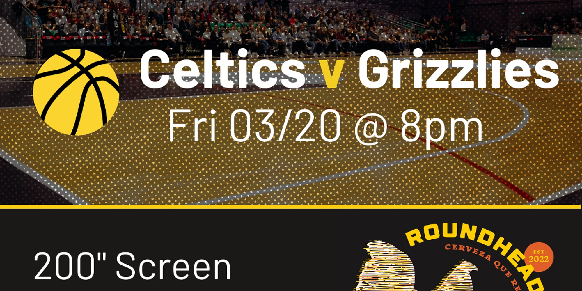 Join us at Roundhead Brewing to catch the Celtics take on the Grizzlies! Great food — Roundhead pizza kitchen open until 8pm GREAT beer — from Roundhead Brewing Company! 200″ GIANT Screen! Free Parking Food Specials! Prizes! Join us for Roundhead’s Watch Party series, with the cinema screen and projector purchased through community investment by Roundhead’s Black Card members. THANK YOU to Black Card members who invested to bring people together through sports y cerveza que reúne at Roundhead!