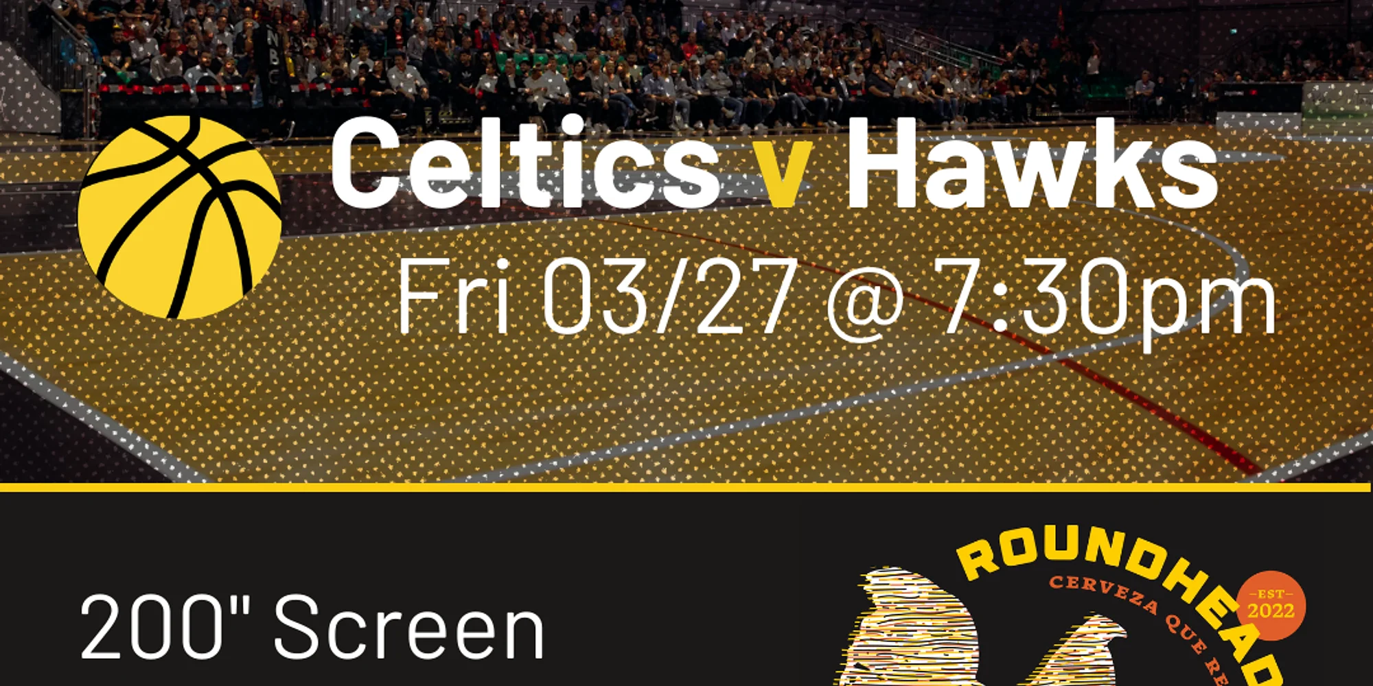 Join us at Roundhead Brewing to catch the Celtics take on the Hawks! Great food — Roundhead pizza kitchen open until 8pm GREAT beer — from Roundhead Brewing Company! 200″ GIANT Screen! Free Parking Food Specials! Prizes! Join us for Roundhead’s Watch Party series, with the cinema screen and projector purchased through community investment by Roundhead’s Black Card members. THANK YOU to Black Card members who invested to bring people together through sports y cerveza que reúne at Roundhead!