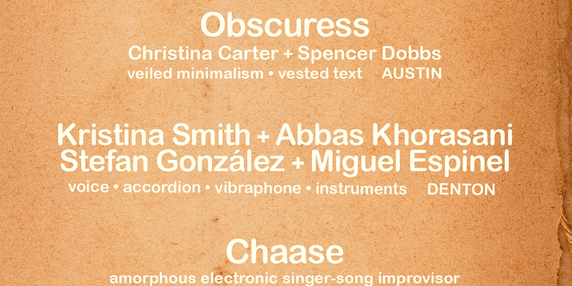 3/22 porous sonorous – other musics and furhter sounds Obscuress is the Austin-based duo of Christina Carter (Charalambides, Tamarisk) and Spencer Dobbs (Virginity, Human Figure), bringing their veiled minimalism, auditory portière, and vested text work to Denton for the first time. While living in Japan, Chase Gardner crafted a way for immediate and amorphous songs that he presents as Chaase. A first-time collaboration between Kristina Smith, Abbas Khorasani, Stefan González, and Miguel Espinel weaves together strains from distinct sound worlds: Trio Glossía, Heavy Baby Sea Slugs, Ruptured Implant, Monte Espina, Orgullo Primitivo, Oil Spill, Yells At Eels, AKHO, Cacodemon, The Young Mothers, and Bog, among other projects. This porous sonorous program reflects on the song as a musical form. Doors 7:30pm Music 8pm $10-20 sliding scale OBSCURESS Longtime supporters of one another’s individual practices, Christina (known for her improvisational vocals and spiritually attuned guitar work) and Spencer (whose eremitic songcraft has been described as “beautiful, deep, desperate, drunken late-in-the-night folk music”) join forces, weaving electric guitars, lap steel, mouth organ, keys, and sampled noise into a dedicated body of songs. CHAASE Singer-song improvisor performing with guitar synthesizer and melodic vocalizations, creating amorphous electronic music with an otherworldly sound. Conceived in Japan in 2020, Chaase was active in the Tokyo underground music scene, playing solo and collaborating with others, as well as performing across the country until recently relocating to Texas. KRISTINA SMITH + ABBAS KHORASANI + STEFAN GONZÁLEZ + MIGUEL ESPINEL Kristina is a multimedia artist working with sound and performance as sites of healing, with an interest in folk traditions. Abbas is a guitarist, sound manipulator and creator of hardware/software based electronic music. Miguel’s wide scope of work is centered on collective musicking and intermedia collaboration. Stefan is a drummer, vibraphonist, and vocalist with deep roots in free jazz and experimental music, with numerous intergenerational, and international, projects across Texas and beyond.
