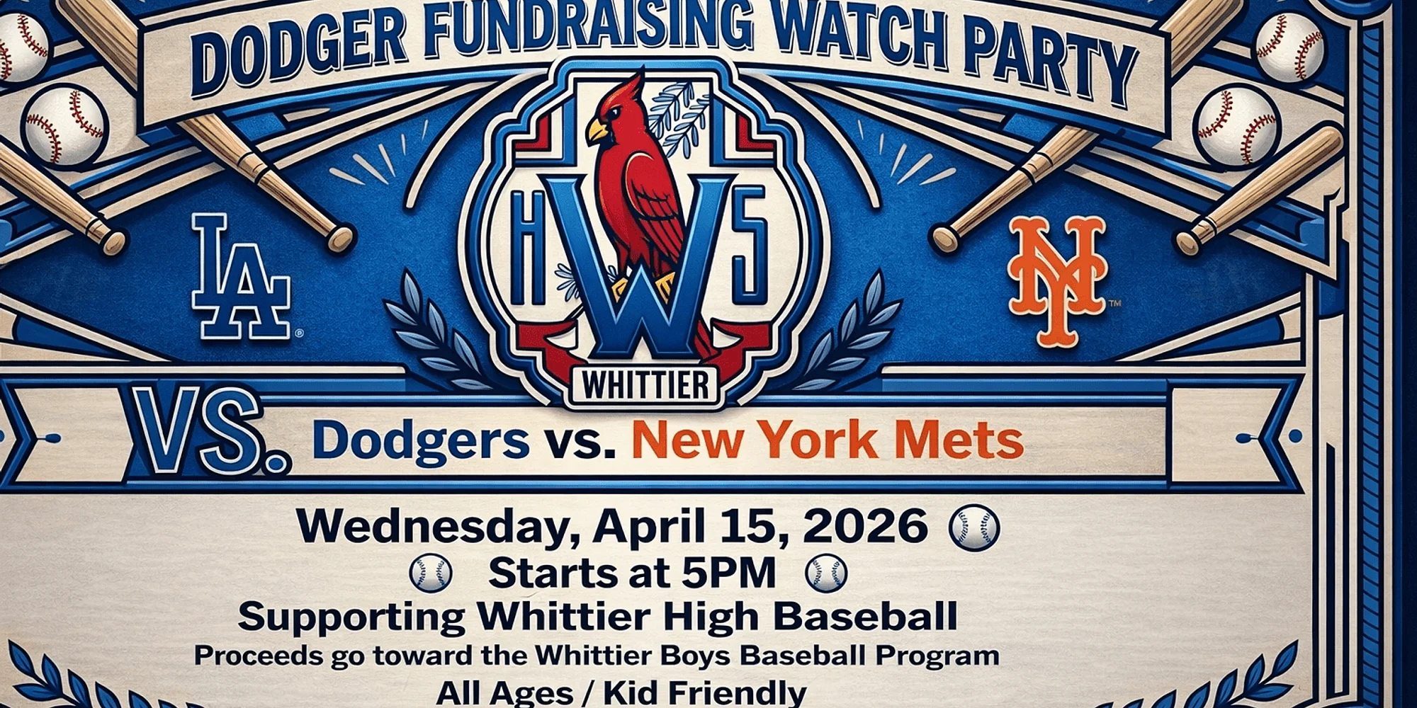 Join us for a free all-ages Dodger watch party supporting Whittier High Baseball. oin us at Sage Whittier for a free Dodger Fundraising Watch Party as the Dodgers take on the New York Mets. This all-ages, kid-friendly event supports Whittier High Baseball, with a portion of proceeds benefiting the Whittier Boys Baseball Program. Bring your family, enjoy the game, and support a great local cause. 📅 Wednesday, April 15, 2026 🕔 Doors / event starts at 5:00 PM ⚾ First pitch at 7:10 PM 📍 Sage Whittier 6511 Greenleaf Ave. Whittier, CA 90601 Come cheer on the Dodgers and support local baseball. All Ages Welcome, Family Friendly.. Seating is first come, first served