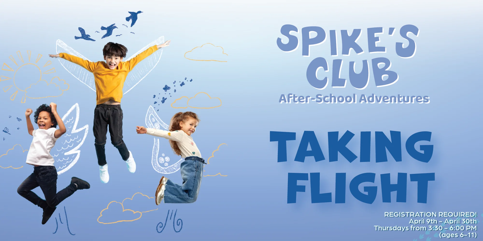 (Ages 6-11) Registration closes on April 7. Spike’s Club inspires children to love learning through active exploration and play. Each Thursday from 3:30 to 6:00 pm children will explore different natural and cultural history themes. During this installment of Spike’s Club, children will explore biological flight in its many different and fascinating forms. This program includes a drop-off window from 3:30 to 3:45 pm and a pick-up window from 5:45 to 6:00 pm. Participants may arrive or depart anytime during the appropriate window. Cost: $95 per 4-week session Click Here to Register