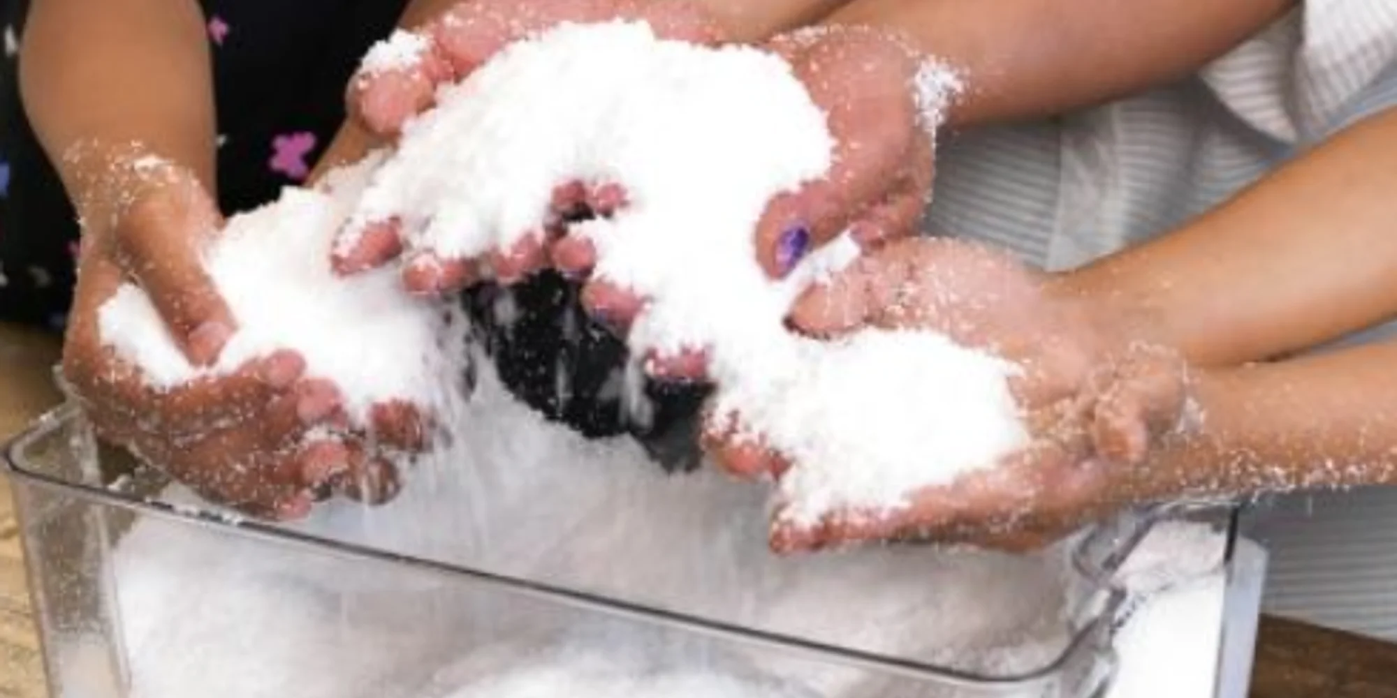 We’re experimenting with two types of “snow.” One: baking soda and hair conditioner create a fluffy, snow-like material. Two: Insta-snow is a superabsorbent polymer (found in baby diapers!) that expands to 100 times its original volume. Which do you prefer?